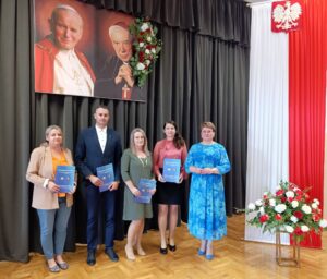 Zespołu Szkół Zawodowych im. Kardynała Stefana Wyszyńskiego w Dynowie akty odebrali: p. Izabela Jach  nauczyciel historii i wiedzy o społeczeństwie, p. Agnieszka Smaroń – nauczyciel przedmiotów zawodowych branży ekonomicznej oraz p. Bartłomiej Walus – nauczyciel wychowania fizycznego. Uroczystego wręczenia aktów dokonali:  Starosta Rzeszowski – p. Krzysztof Jarosz, Wicestarosta Rzeszowski – p. Jerzy Bednarz oraz p, Elżbieta Kubicka  Dyrektor Wydziału Społeczno-Oświatowego. Towarzyszyło temu ślubowanie złożone przez nauczycieli. Przedstawiciele władz powiatu pogratulowali pedagogom osiągnięć, podkreślając ich zaangażowanie i wkład w rozwój młodzieży. To wyjątkowe wydarzenie stanowiło nie tylko moment oficjalnego uhonorowania pracy nauczycieli, ale także okazję do podkreślenia, jak ważna jest rola szkoły i kadry pedagogicznej w budowaniu przyszłości młodego pokolenia. W tym samym dniu, podczas posiedzenia rady pedagogicznej, także nauczyciele otrzymali  umowy na postawie mianowania. Wszystkim, którzy awansowali gratulujemy i życzymy powodzenia w nowym roku szkolnym.
