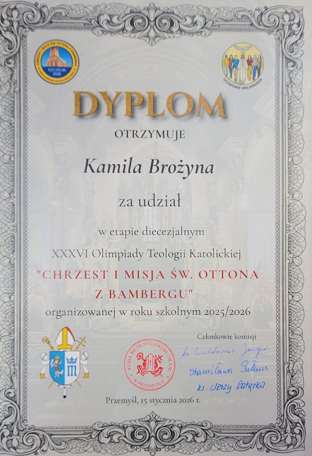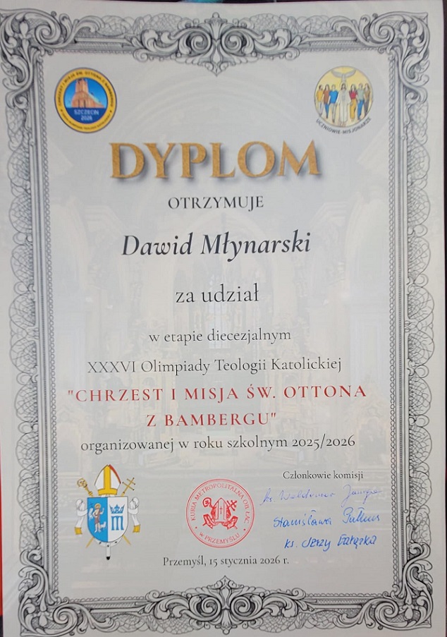Zespół Szkół Zawodowych im. Kardynała Stefana Wyszyńskiego w  Dynowie, w etapie  diecezjalnym reprezentowali: Dawid Młynarski z klasy 1TPL i Kamila Brożyna z klasy 3TL, zdobywcy dwóch pierwszych miejsc etapu szkolnego. Celem olimpiady jest edukacja religijna młodzieży, umacnianie wiedzy religijnej. Przyjęta formuła ma na celu zarówno sprawdzenie zdobytej wiedzy religijnej, jak i sprzyjanie rozwojowi wiary młodego człowieka. Uczniom dziękujemy za udział i życzymy dalszych sukcesów! Opiekunem uczniów był ks. Dominik Majchrowicz.