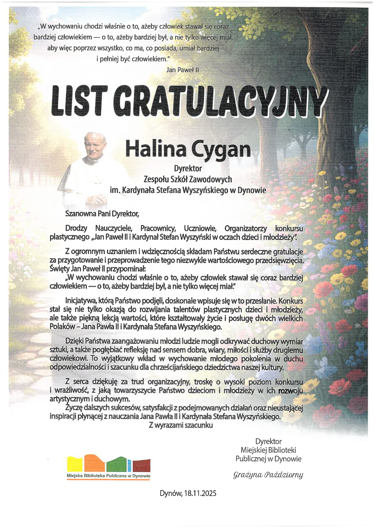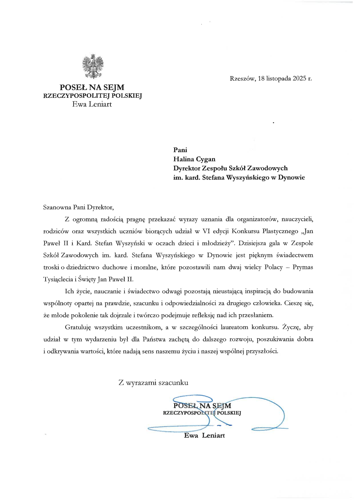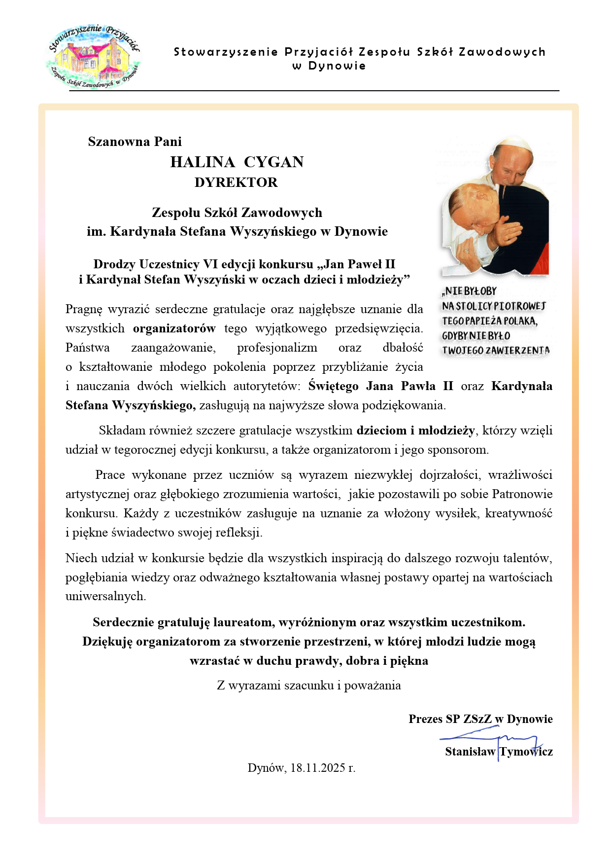 Zespół Szkół Zawodowych im. Kardynała Stefana Wyszyńskiego w Dynowie i Stowarzyszenie Przyjaciół Zespołu Szkół Zawodowych w Dynowie byli organizatorami VI edycji konkursu plastycznego „Jan Paweł II i Kardynał Stefan Wyszyński w oczach dzieci i młodzieży” dla szkół z Pogórza Przemysko – Dynowskiego pod honorowym patronatem: Poseł na Sejm RP dr Ewy Leniart, Starosty Rzeszowskiego dra Krzysztofa Jarosza, Dziekana Dekanatu Dynów Ks. Prałata dra Norberta Podhoreckiego, Wójta Gminy Dynów Wojciecha Piecha, Burmistrza Miasta Dynów Zygmunta Frańczaka, Nadleśniczego Nadleśnictwa Dynów Jacka Gałuszki, Dyrektora Miejskiej Biblioteki Publicznej w Dynowie Grażyny Paździornej, Dyrektora Miejskiego Ośrodka Kultury, Sportu i Rekreacji Łukasza Domina oraz patronatem medialnym: Radia FARA – Rozgłośni Archidiecezji Przemyskiej „Via” Katolickiego Radia Rzeszów.