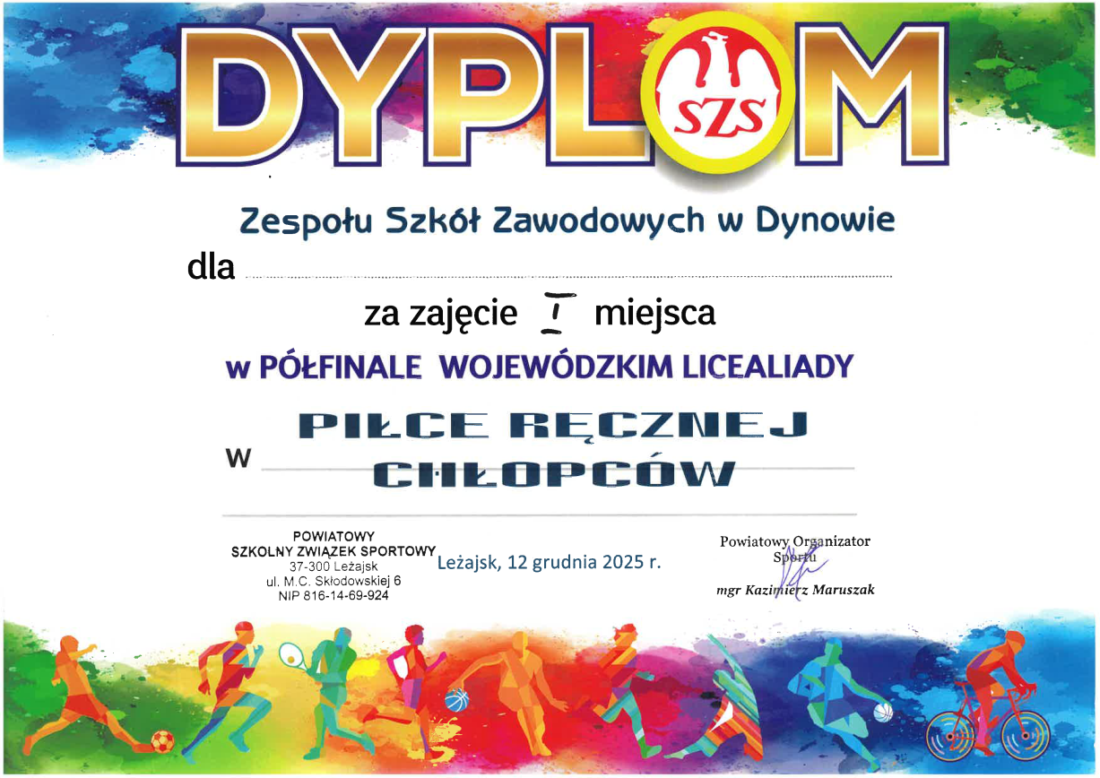 W dniu 12 grudnia 2025 r. w Zespole Szkół Licealnych w Leżajsku odbył się Półfinał Wojewódzki Licealiady w piłce ręcznej chłopców. Drużyna naszej szkoły w składzie: Maciej Sarnicki, Franciszek Drewniak, Kacper Chrapek, Wiktor Paździorny, Filip Goleś, Jakub Kędzior, Robert Jandziś, Bartłomiej Duda, Łukasz Bachurski, Kacper Łach, Krystian Skarbiński, Radosław Dziura, Emmanuel Dańczak i Bartosz Chrapek, po bardzo wyrównanej i emocjonującej walce, szczególnie z drużyną gospodarzy zdobyła I miejsce i awansowała do Finału Wojewódzkiego.