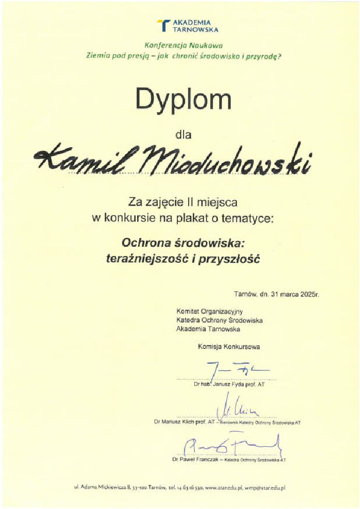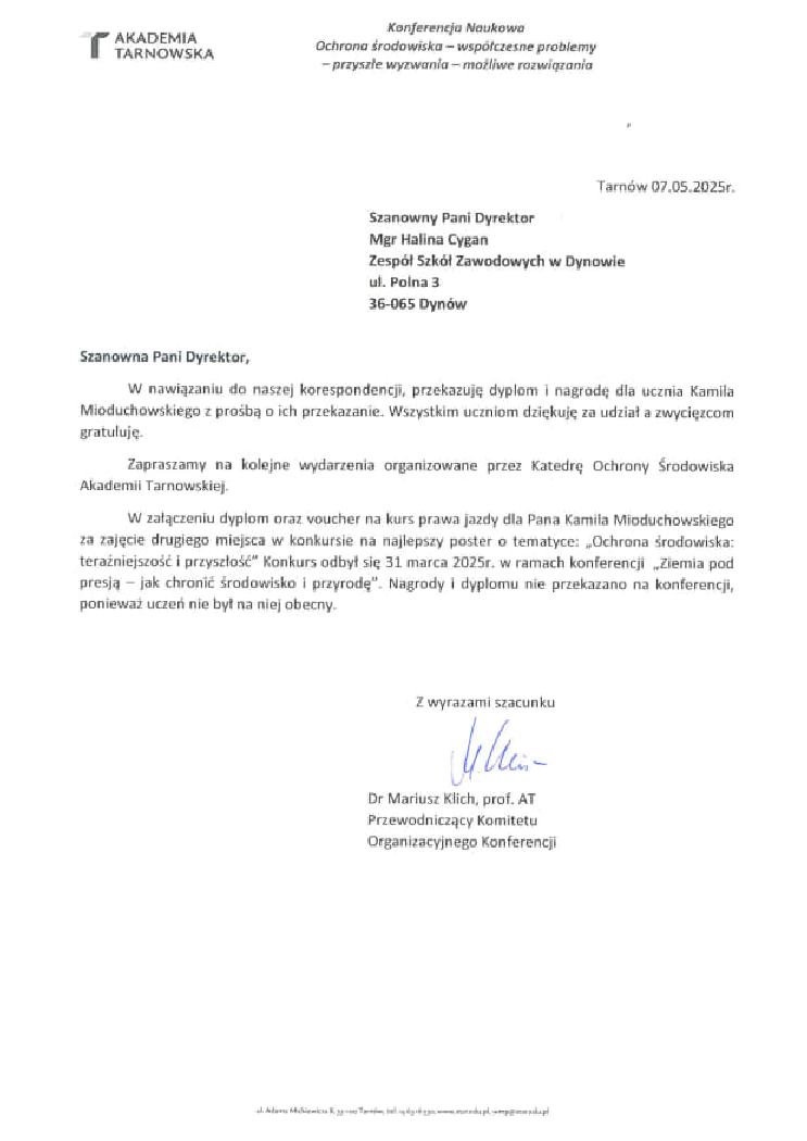 Podczas konferencji „Ziemia pod presją – jak chronić środowisko i przyrodę”, zorganizowanej przez Katedrę Ochrony Środowiska Akademii Tarnowskiej, rozstrzygnięto konkurs na najlepszy poster promujący ochronę przyrody. Z dumą informujemy, że II miejsce w konkursie zajął Kamil Mioduchowski, uczeń (kl. 3TI) 5 – letniego Technikum w Zespole Szkół Zawodowych im. Kardynała Stefana Wyszyńskiego w Dynowie w zawodzie technik informatyk. To kolejny znaczący sukces naszego ucznia. Opiekunem pracy konkursowej był Pan Paweł Siwulec, który wspierał Kamila w przygotowaniach i realizacji projektu. Serdecznie gratulujemy i życzymy kolejnych sukcesów.