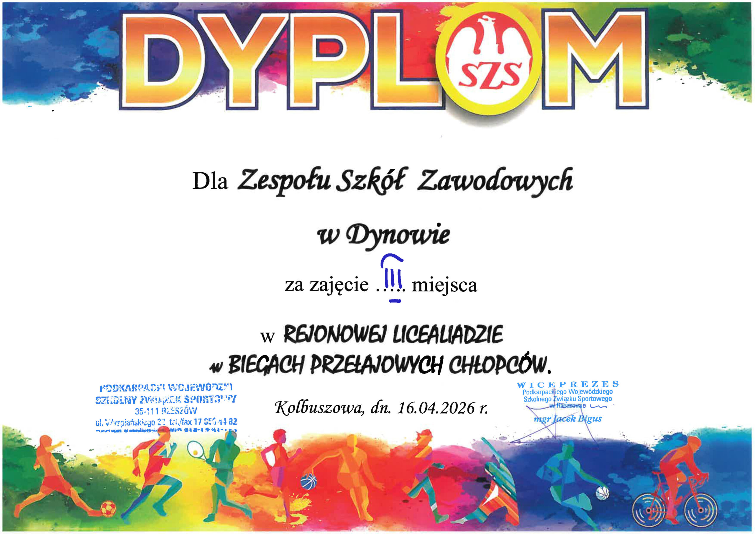 16 kwietnia 2026 r. w Kolbuszowej przy stadionie miejskim odbyła się Rejonowa Licealiada w drużynowych biegach przełajowych. Po zaciętej walce drużyna w składzie: Krzysztof Pustelnik, Dawid Młynarski, Emil Sura, Krystian Zdybek, Dawid Zawadzki i Łukasz Karaś zajęła III miejsce. Warto nadmienić że nasz zespół wystąpił w bardzo odmienionym składzie w porównaniu z rokiem poprzednim. Opiekunem drużyny był: p. Marek Paściak. Uczniom i opiekunowi gratulujemy i życzymy powodzenia za rok!!!