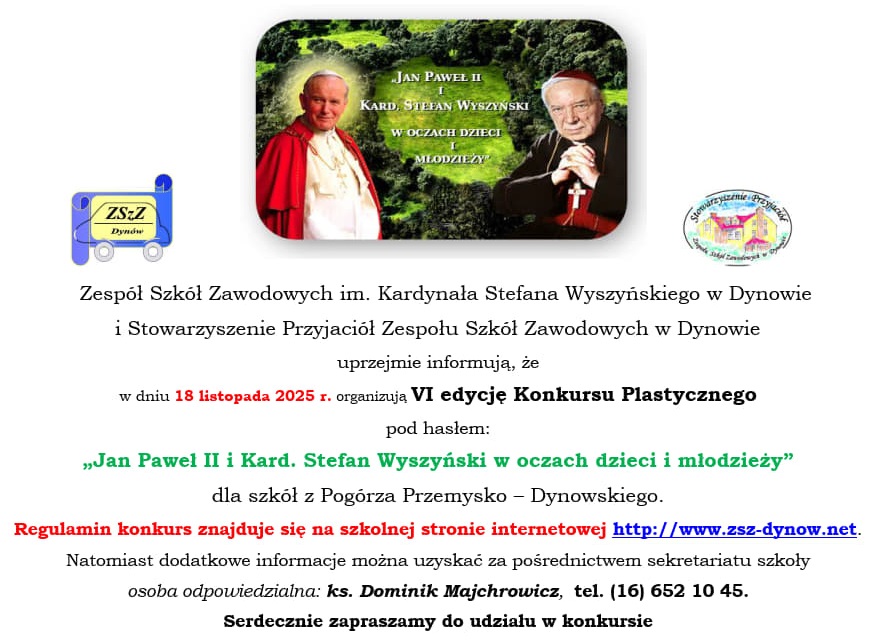 Zespół Szkół Zawodowych im. Kardynała Stefana Wyszyńskiego w Dynowie i Stowarzyszenie Przyjaciół Zespołu Szkół Zawodowych w Dynowie zapraszają uczniów szkół z Pogórza Przemysko – Dynowskiego do udziału w konkursie plastycznym pod hasłem: „Jan Paweł II i Kard. Stefan Wyszyński w oczach dzieci i młodzieży”