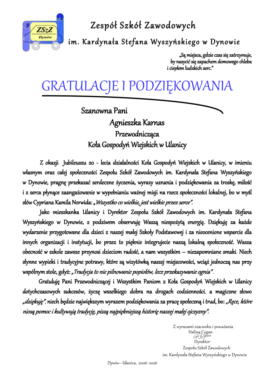 W dniu 7 lutego 2026 r. Koło Gospodyń Wiejskich w Ulanicy obchodziło Jubileusz 20-lecia działalności.  Uroczystości rozpoczęła mszą św. w kościele parafialnym pw. św. Józefa Robotnika w Ulanicy, odprawiona przez  proboszcza tej parafii – ks. Andrzeja Wójcika. Dalsza część uroczystości odbyła się w Domu Ludowym w Ulanicy, na wstępie, której  członkinie koła powitały zaproszonych gości oraz przedstawiły w zarysie historię i dokonania: Przewodnicząca KGW Ulanica, a zarazem sołtys wsi Ulanica – Pani Agnieszka Karnas wraz z Panią Justyną Rębiś. W uroczystościach wzięli udział: Wójt Gminy Dynów – Pan Wojciech Piech,  Sekretarz Gminy Dynów – Pani Zofia Kalawska, radna Gminy Dynów – Pani Lucyna Tworzydło, proboszcz parafii pw. św. Józefa Robotnika w Ulanicy – ks. Andrzej Wojcik, Dyrektor Zespołu Szkół Zawodowych im. Kardynała Stefana Wyszyńskiego w Dynowie – Pani Halina Cygan, Prezes Zarządu Ochotniczej Straży Pożarnej w Ulanicy – druh Grzegorz Mnich wraz z delegacją druhów strażaków, Dyrektor Gminnej Biblioteki Publicznej w Dynowie z siedzibą w Bachórzu – Pani Mariola Kaczor, przedstawicielka Lokalnej Grupy Działania Pogórze Przemysko–Dynowskie – Pani Mirosława Marszałek-Pełzak, delegacje wszystkich Kół Gospodyń Wiejskich z terenu Gminy Dynów.  Obecny Zarząd KGW w Ulanicy wraz z Panem Wójtem Wojciechem Piechem uhonorował specjalnymi statuetkami, dyplomami, medalami i kwiatami najstarsze członkinie koła.  Poza tym specjalne – jubileuszowe medale, pamiątkowe zestawy, otrzymali wszyscy zaproszeni goście, w tym Pani Dyrektor Halina Cygan oraz członkinie koła.  Do Jubilatek z KGW w Ulanicy i uczestników spotkania, w swoim wystąpieniu Pani Dyrektor Halina Cygan zawarła gratulacje, słowa uznania i powiedziała m.in.