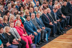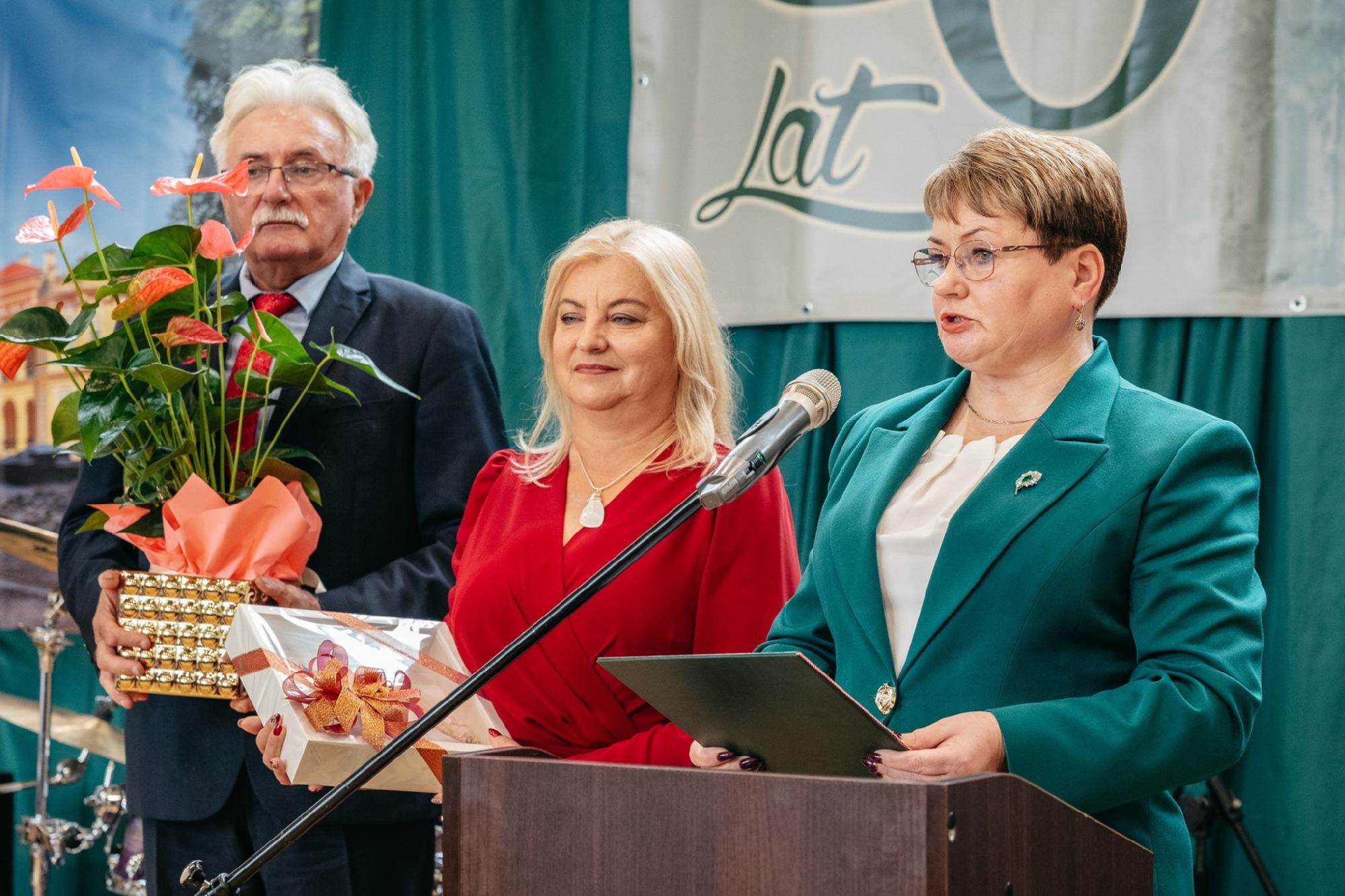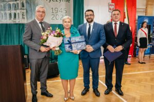 Pani Dyrektor Halina Cygan w imieniu Zespołu Szkół Zawodowych im. Kardynała Stefana Wyszyńskiego w Dynowie, a także w imieniu pozostałych dyrektorów szkół i placówek oświatowych prowadzonych przez Powiat Rzeszowski, wspólnie z Panią Elżbietą Klaczak–Łach – dyrektorem LO w Dynowie i Panem Januszem Jakubkiem – dyrektorem ZSTW w Trzcianie, przekazali na ręce Pani Dyrektor – Doroty Tarańskiej-Klęsk, list gratulacyjny, okolicznościowy prezent i kwiaty. W trakcie uroczystości odbył się przepiękny montaż słowno – muzyczny w wykonaniu uczniów, absolwentów szkoły, nauczycieli i zaproszonych gości. Gratulujemy pięknego jubileuszu i dziękujemy za zaproszenie.