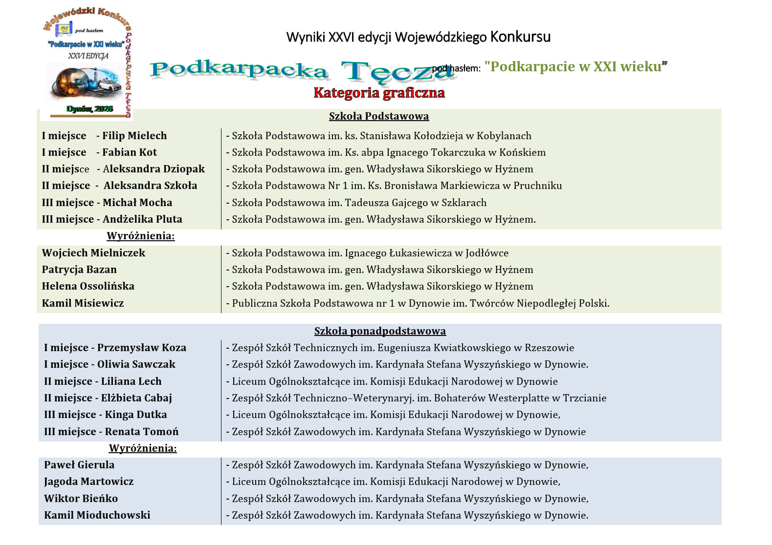 W dniu 23 marca 2026 r. w Zespole Szkół Zawodowych im. Kardynała Stefana Wyszyńskiego w Dynowie odbyły się obrady jury, oceniającego prace w kategorii graficznej. Zadaniem uczestników jest zaprojektowanie oryginalnej pocztówki promującej Podkarpacie. Praca mogła łączyć walory kulturowe (np. zabytki, szlaki architektury drewnianej i inne), krajobrazowe (np. przyroda) z kreatywna formą graficzną. Uczniowie mogli wybrać odpowiednią stylistykę: a) retro/vintage, b) nowoczesny/ minimalistyczny, c) humorystyczny. Wydrukowany projekt pocztówki można było wykonać w programie graficznym (np. Canva, GIMP, Photoshop).Z całego Podkarpacia na konkurs w tej kategorii wpłynęło 60 prac! (zgodnie z regulaminem każda szkoła mogła przesłać nie więcej niż 10 prac). /…/ pełny tekst ..>>pdf