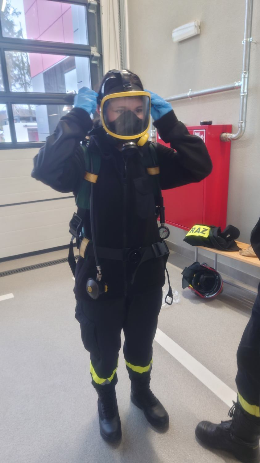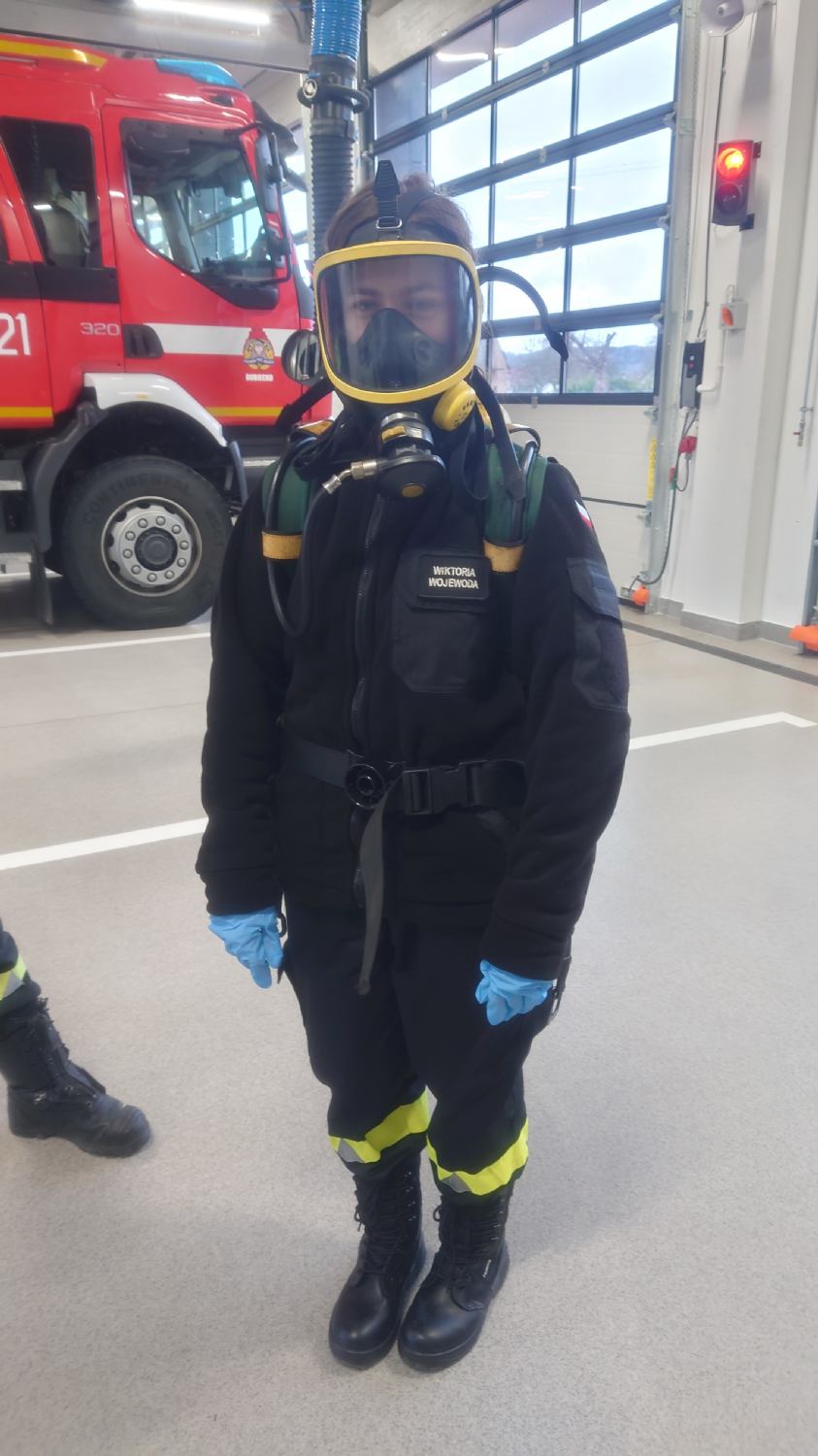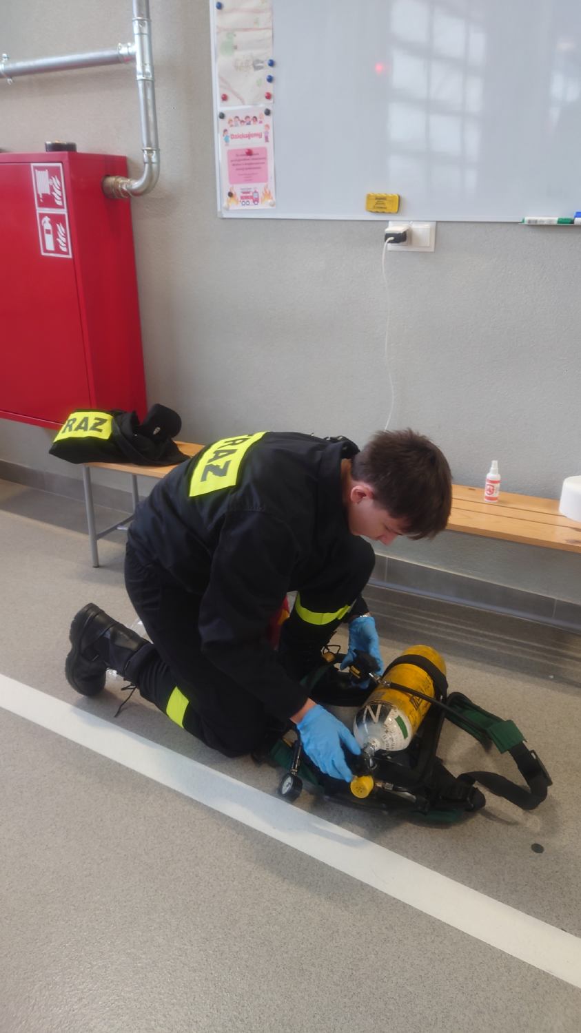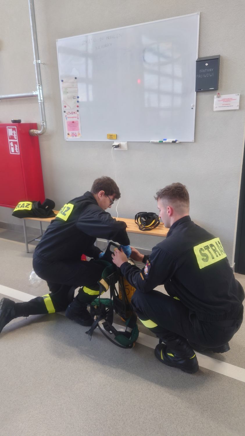 W dniu 09.12.2025r. uczniowie klasy 1TL (5 – letnie technikum w zawodzie technik logistyk z innowacją pedagogiczną ratowniczo – pożarniczą) na terenie Jednostki Ratowniczo-Gaśniczej w Dubiecku mieli okazję po raz kolejny zetknąć się z profesjonalnym sprzętem wykorzystywanym przez strażaków, a dokładniej z aparatami powietrznymi ODO. Podczas zajęć została omówiona budowa i zasada działania aparatu, procedura przygotowania go do pracy oraz zasady poprawnego użytkowania. Każdy uczeń mógł założyć maskę, sprawdzić jej dopasowanie oraz zapoznać się z najważniejszymi elementami, na które zwraca uwagę ratownik przed wejściem do działań. Aparat jest podstawowym zabezpieczeniem w środowisku zadymionym oraz wszędzie tam, gdzie nie ma bezpiecznego dostępu do powietrza. Takie doświadczenia budują świadomość odpowiedzialności i pokazują, że praca strażaka opiera się na znajomości sprzętu, jego poprawnym przygotowaniu oraz zasadach bezpieczeństwa. Uczniowie odbyli zajęcia pod opieką Pana Piotra Marcinka i mł. asp. Jacka Lignowskiego.
