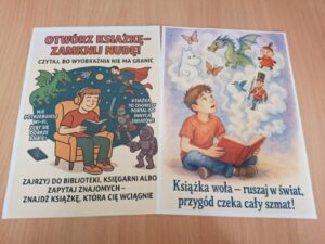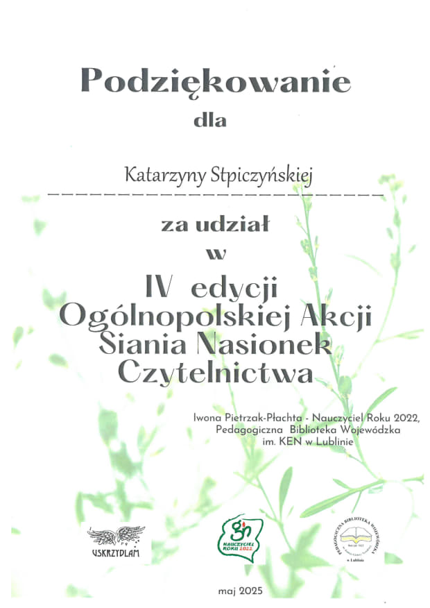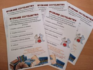 Drugim wydarzeniem było zorganizowanie wyzwania czytelniczego, w którym uczniowie mieli przeczytać 6 książek w przeciągu miesiąca. Oczywiście, żeby nie było zbyt łatwo, i aby zmotywować uczniów do sięgania po pozycje, które może nie są dla nich zbyt zachęcające, uczniowie otrzymali na karcie z wyzwaniem wskazówki, jakie książki mają przeczytać. Bardzo cieszy fakt, że do udziału w akcji zgłosiło się kilkanaście osób a w terminie wyzwanie ukończyło pięcioro z nich: Klaudia Pawełek z kl. 1THI, Kacper Rogosz z kl. 3TL, Alicja Kowal z kl. 4THL, Roksana Skrabut z kl. 4THL oraz Maria Duda z kl. 1THI. Osoby nagrodzone w obu akcjach czytelniczych otrzymały nagrody książkowe z życzeniami miłej lektury i tysięcy przeczytanych stron. Obie akcje były włączone do IV edycji Ogólnopolskiej Akcji Siania Nasionek Czytelnictwa organizowanej przez Pedagogiczną Bibliotekę Wojewódzką im. KEN w Lublinie. Koordynatorką i organizatorką tych szkolnych wydarzeń była p. Katarzyna Stpiczyńska