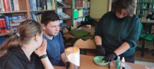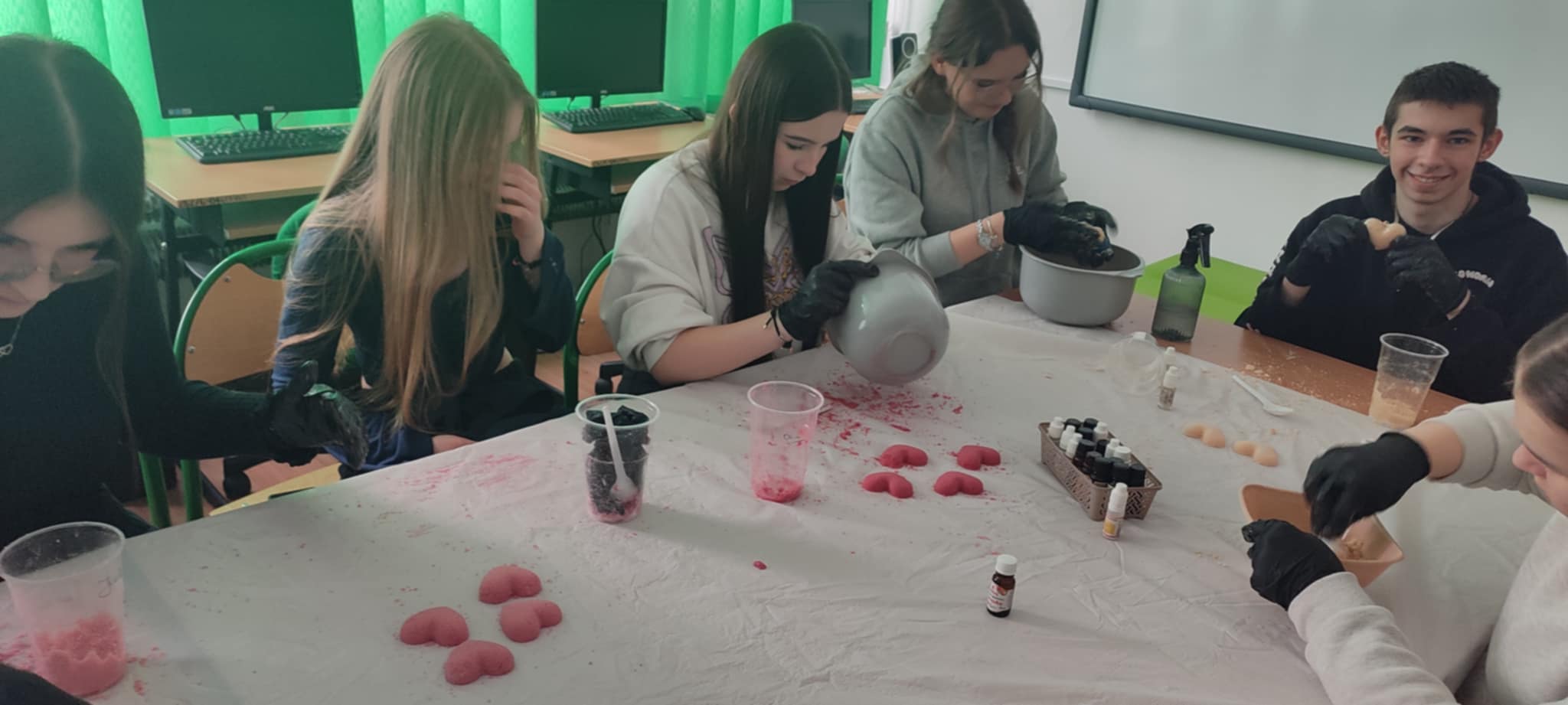 W Zespole Szkół Zawodowych im. Kardynała Stefana Wyszyńskiego w Dynowie, w ramach innowacji pedagogicznej Nowoczesne technologie w produkcji kosmetyków na kierunku technik handlowiec uczniowie mieli możliwość zdobycia wiedzy, m.in. o surowcach kosmetycznych, innowacyjnych nowoczesnych składnikach aktywnych, historii kosmetyków, o zastosowaniu nowych technologii w produkcji, a także utrwalić zdobytą wiedzę o budowie skóry, chorobach i procesach starzenia się, sposobach dbania o zdrowie, profilaktyce raka, alergiach oraz o aromaterapii i ziołolecznictwie. Zdobyta wiedza na temat naturalnych kosmetyków, bez chemii i konserwantów, technologiach wykorzystywanych w produkcji kosmetyków takich jakich jak kremy, żele, produkty do ciała, włosów, czy perfum. Przeprowadzaliśmy ćwiczenia analizując składy wybranych kosmetyków i tworzyliśmy przykładowe receptury, sketchnotingi, prezentacje komputerowe. Zdobyta wiedza, została połączona z praktyką. Razem z Panią Kasią Spiczyńską, wykorzystując jej ogromną wiedzę i umiejętności, zostały zorganizowane warsztaty robienia własnych naturalnych kosmetyków, dzięki czemu uczniowie mogli wykorzystać swoją kreatywność, eksperymentować z recepturami i tworzyć unikalne naturalne prezenty dla siebie lub bliskich. Odrobina chęci, ciekawe przepisy, dobrej jakości półprodukty, niektóre dostępne w pobliskich nam sklepach @ oraz kilka trików Pani Kasi i Agnieszki pozwoliły stworzyć wyjątkowe, skuteczne i pachnące naturalne kosmetyki. Na warsztatach uczniowie „kręcili” kremy, tworzyli niebiańsko pachnące kule musujące i cudowne mydełka, aromatyczne sole do kąpieli. Sami decydowali o zapachu, kolorze, formie i składzie, doskonale się przy tym bawiąc. Odkrywali aromaty i poznawali skuteczność i wpływ na nasze zdrowie wielu ziół. Bawiąc się, pogłębiali swoją świadomość na temat naturalnych kosmetyków. Własne produkty mogli zaprezentować na forum, tworząc reklamy, aby jak najlepiej wypromować swój kosmetyk. Było przy tym wiele radości i śmiechu. Nie tylko szkoła podąża za obecną modą i trendami, ale także świadomie uczy młodzież dbać o swoje zdrowie i urodę. Dziękujemy bardzo Pani Dyrektor, za możliwość wzięcia udziału w tych inspirujących, twórczych i kreatywnych warsztatach. W przyszłym roku również liczymy na dobrą zabawę i taką możliwość@