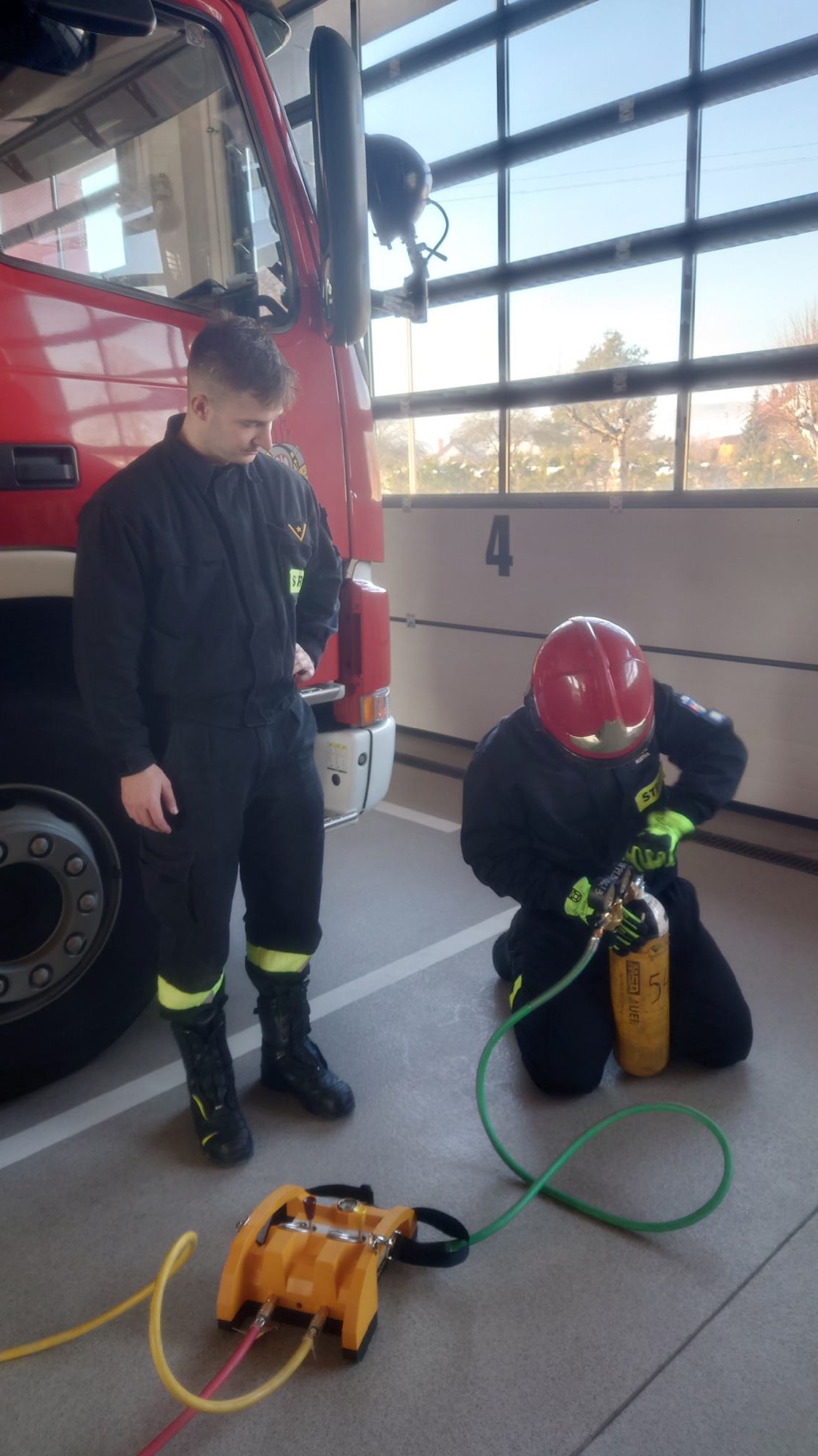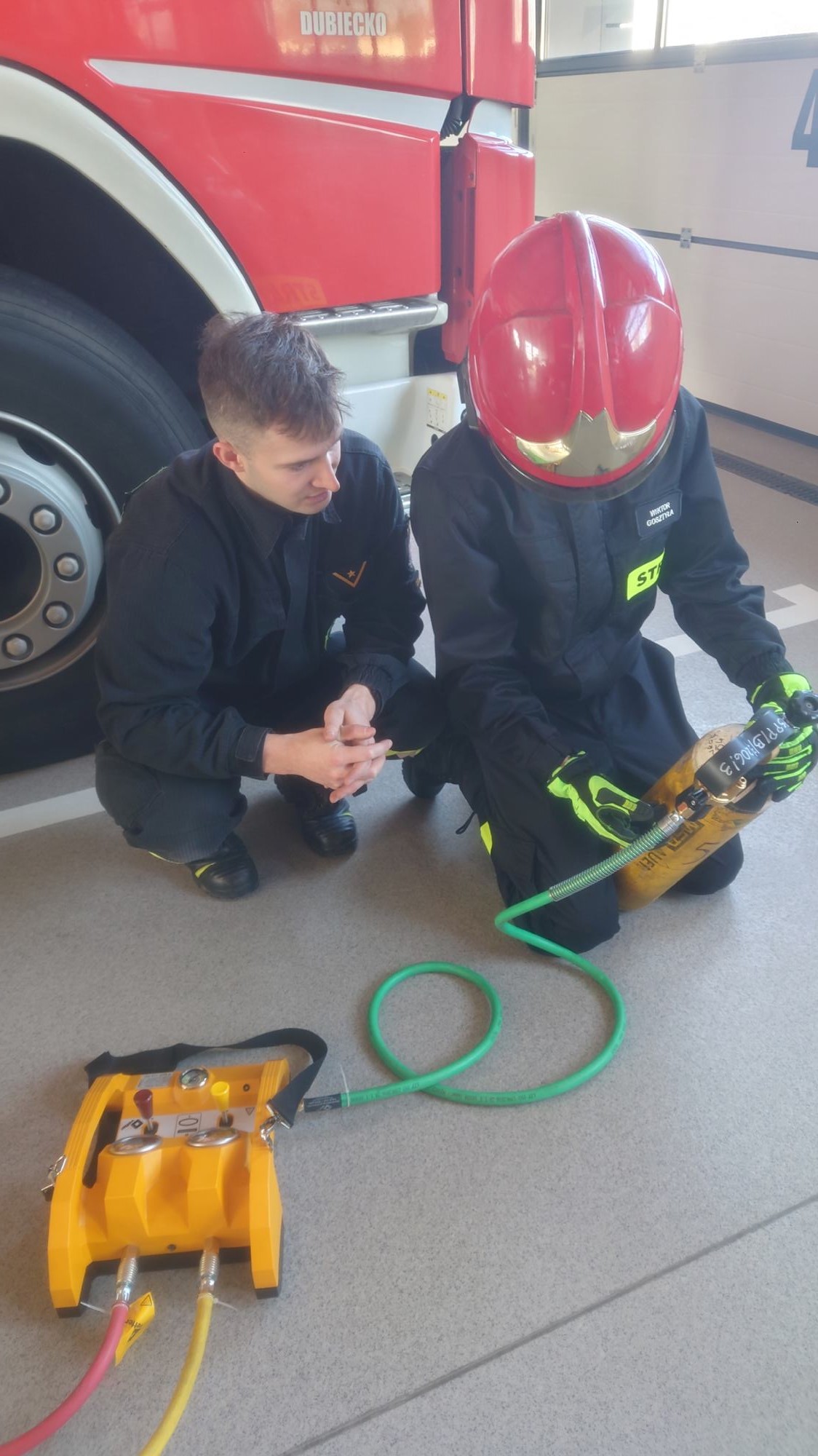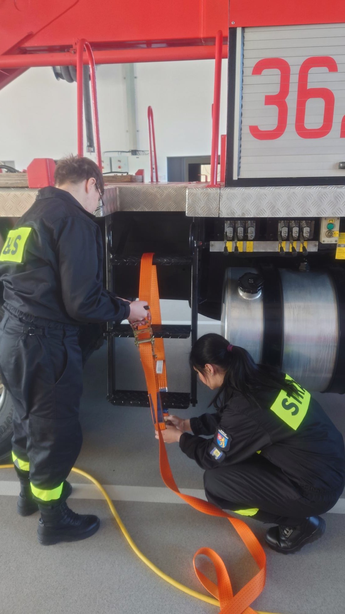 Uczniowie skupili się na technicznej stronie działania zestawu – prawidłowym sprawianiu sprzętu, podłączaniu osprzętu sterującego oraz napełnianiu poduszek. Ze względu na charakter szkolenia nie wykonywano prób z rzeczywistym obciążeniem. Drugim elementem zajęć była obsługa pasów transportowych, znajdujących zastosowanie zarówno w działaniach ratowniczych, jak i w życiu pozaszkolnym. Uczniowie ćwiczyli prawidłowe prowadzenie pasów, ich mocowanie oraz napinanie, poznając zasady bezpiecznego i poprawnego użytkowania tego typu sprzętu. Zajęcia odbyły się pod opieką Pana Piotra Marcinka oraz mł. asp. Jacka Lignowskiego. Podziękowania kierujemy do Komendy Miejskiej PSP w Rzeszowie oraz Komendy Miejskiej PSP w Przemyślu za wsparcie i współpracę przy realizacji zajęć w JRG Dubiecko.