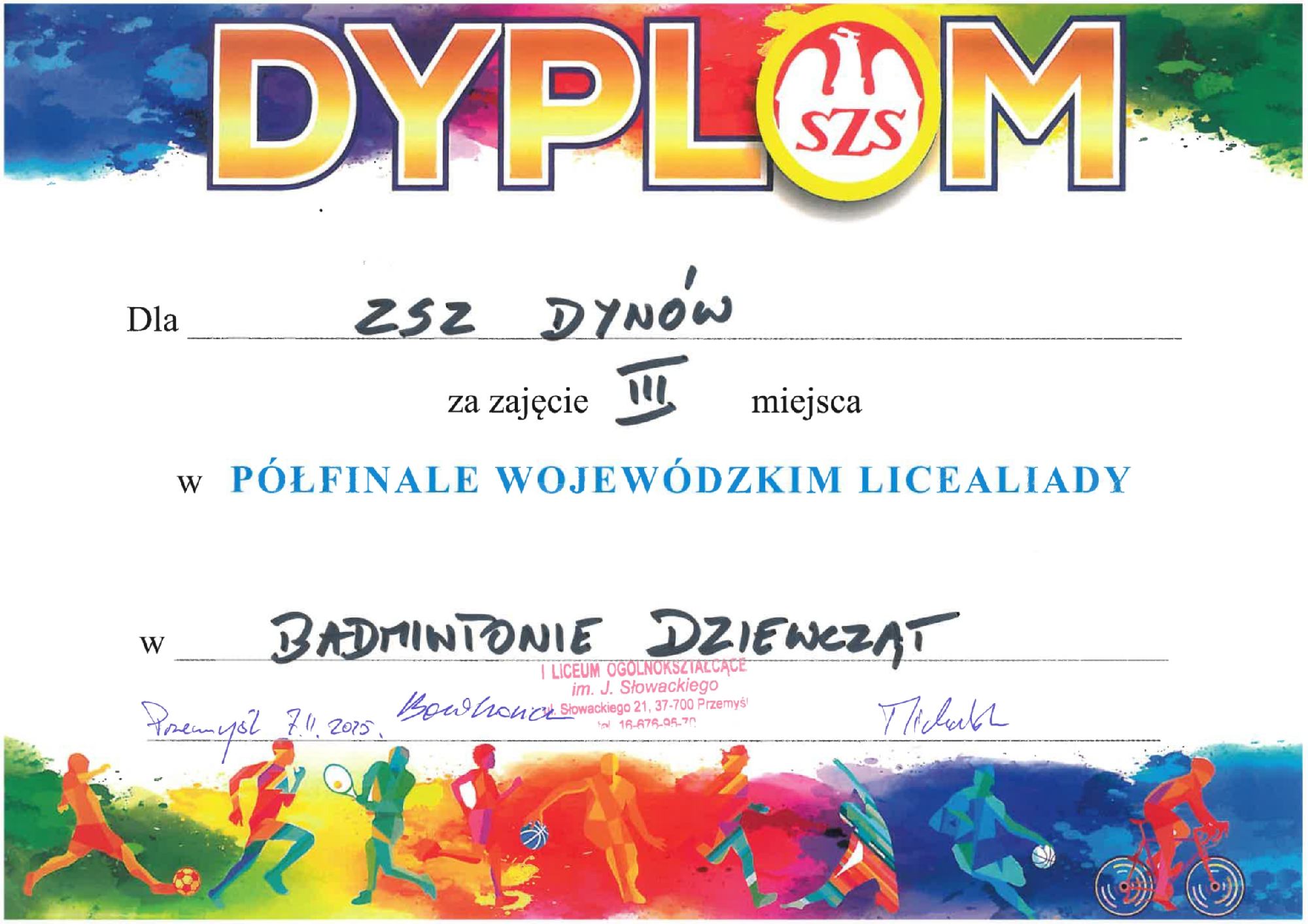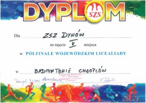 W dniu 07 listopada 2025 r. w I Liceum Ogólnokształcącym w Przemyślu odbył się Półfinał Wojewódzki Licealiady w badmintonie dziewcząt i chłopców. W zawodach tych wzięła udział reprezentacja Zespołu Szkół Zawodowych im. Kard. Stefana Wyszyńskiego w Dynowie w kategorii dziewcząt w składzie: Kamila Brożyna – kl. 3TL, Wiktoria Grzegorzak – kl. 4TL, Daria Kijowska – kl. 4TL, Aleksandra Niedzielska – kl. 3TL oraz w kategorii chłopców w składzie: Chrapek Kacper – kl. 5TI, Goleś Filip – kl. 4TL, Paździorny Wiktor – kl. 5TI oraz Sarnicki Maciej – kl. 3a.