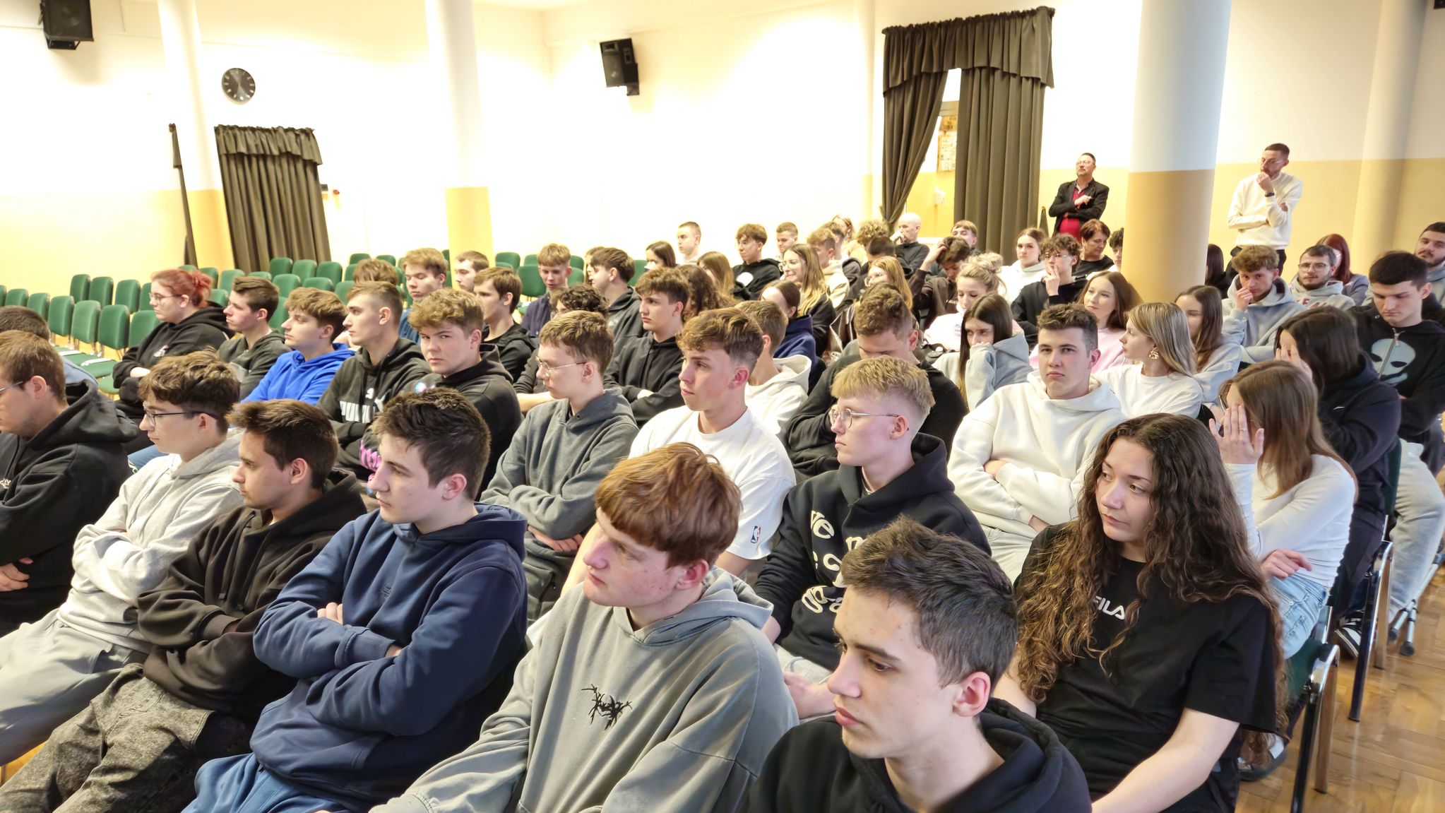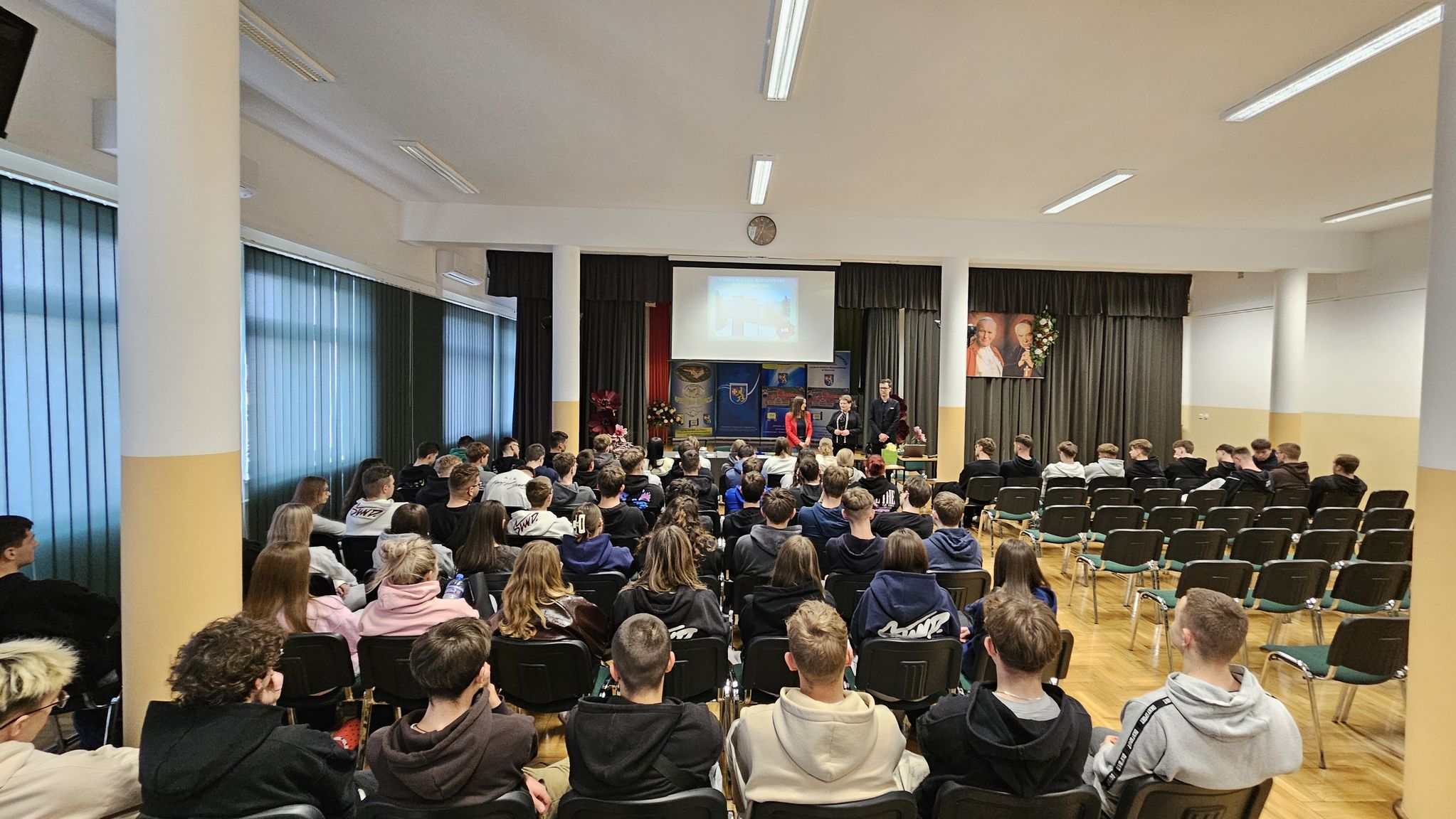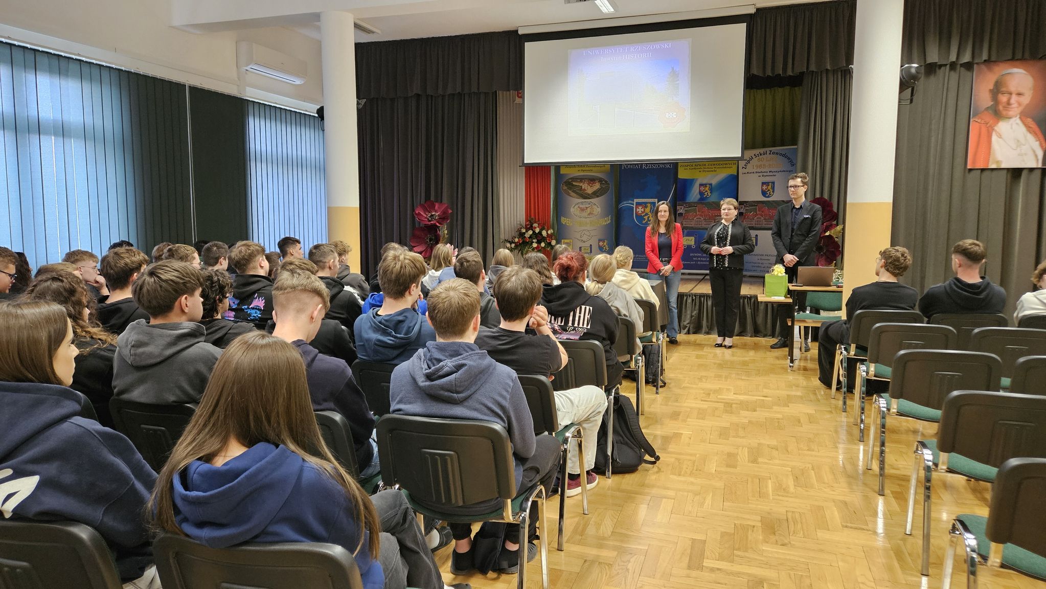 W dniu 17 marca 2026 r. w auli szkolnej odbyło się spotkanie uczniów z klas: 4TI i 5TI (technik informatyk), 4TPS (technik pojazdów samochodowych), 4TH (technik handlowiec) z przedstawicielami Instytutu Historii Uniwersytetu Rzeszowskiego. Tematem spotkania była oferta edukacyjna uczelni na rok akademicki 2026/2027. Uczniowie mieli możliwość zapoznania się z bazą dydaktyczną, ofertą edukacyjną zajęć obowiązkowych i dodatkowych, czyli z tym wszystkim co przyszłemu studentowi może być potrzebne. Spotkanie prowadzili: dr Małgorzata Skulimowska – zastępca dyrektora Instytutu Historii i mgr Bartosz Korczyński – pracownik naukowy instytutu. Zespół Szkół Zawodowych im. Kard. Stefana Wyszyńskiego w Dynowie współpracuje z wieloma wyższymi uczelniami w tym również z Uniwersytetem Rzeszowskim.