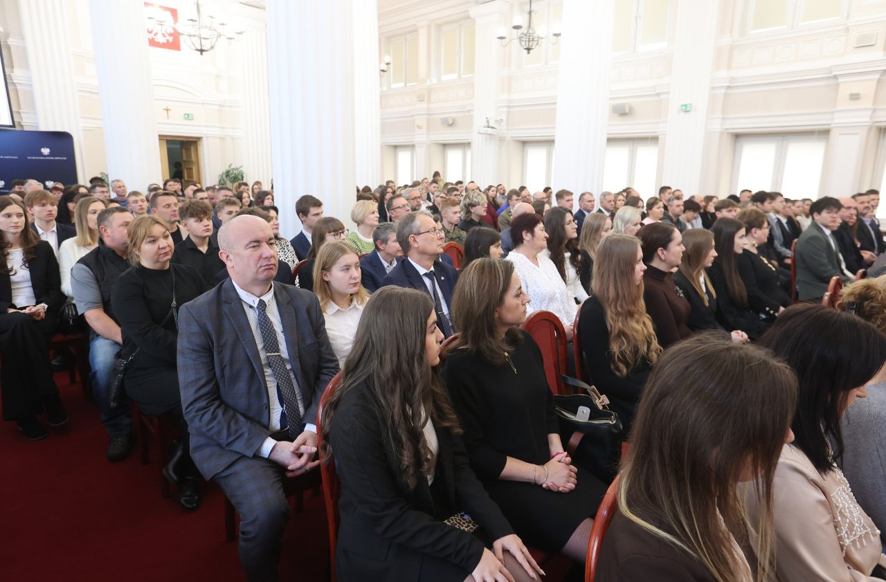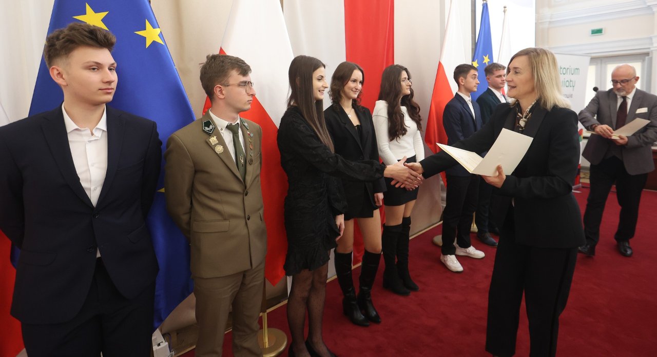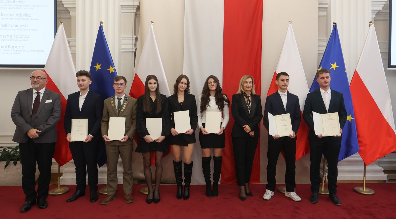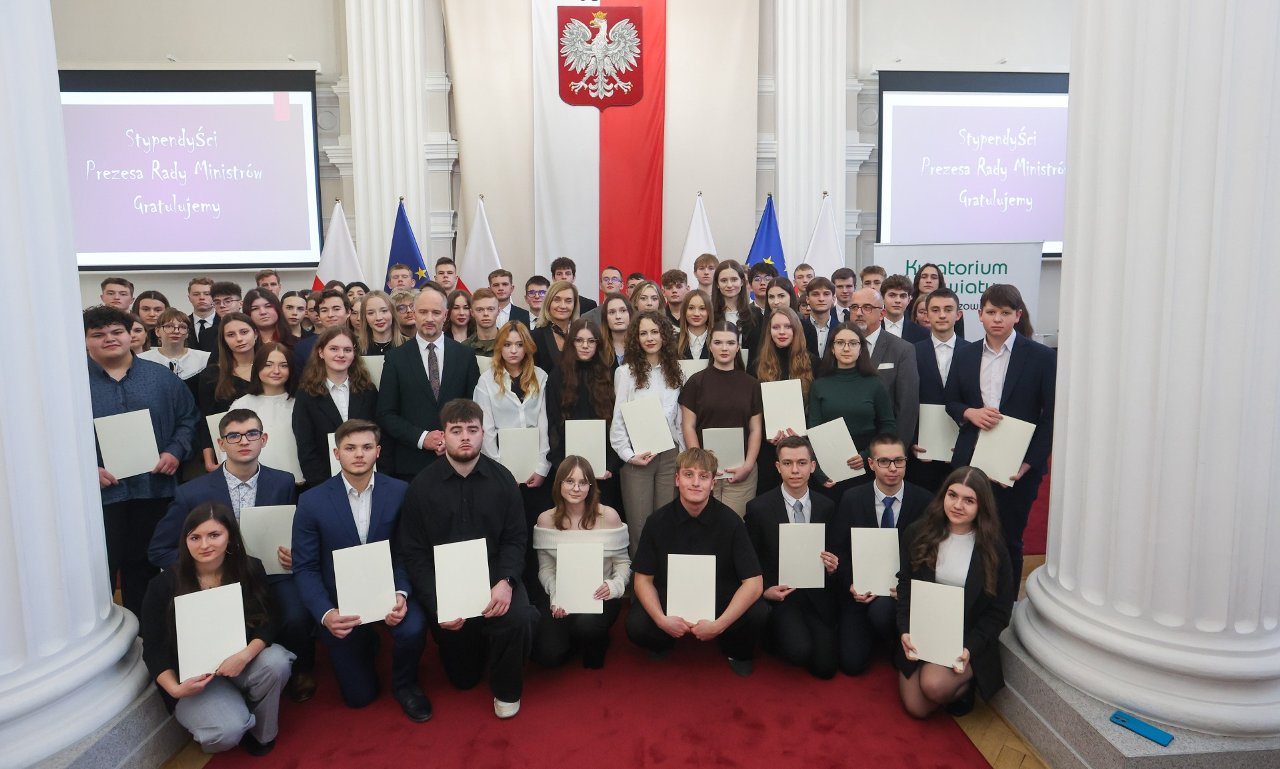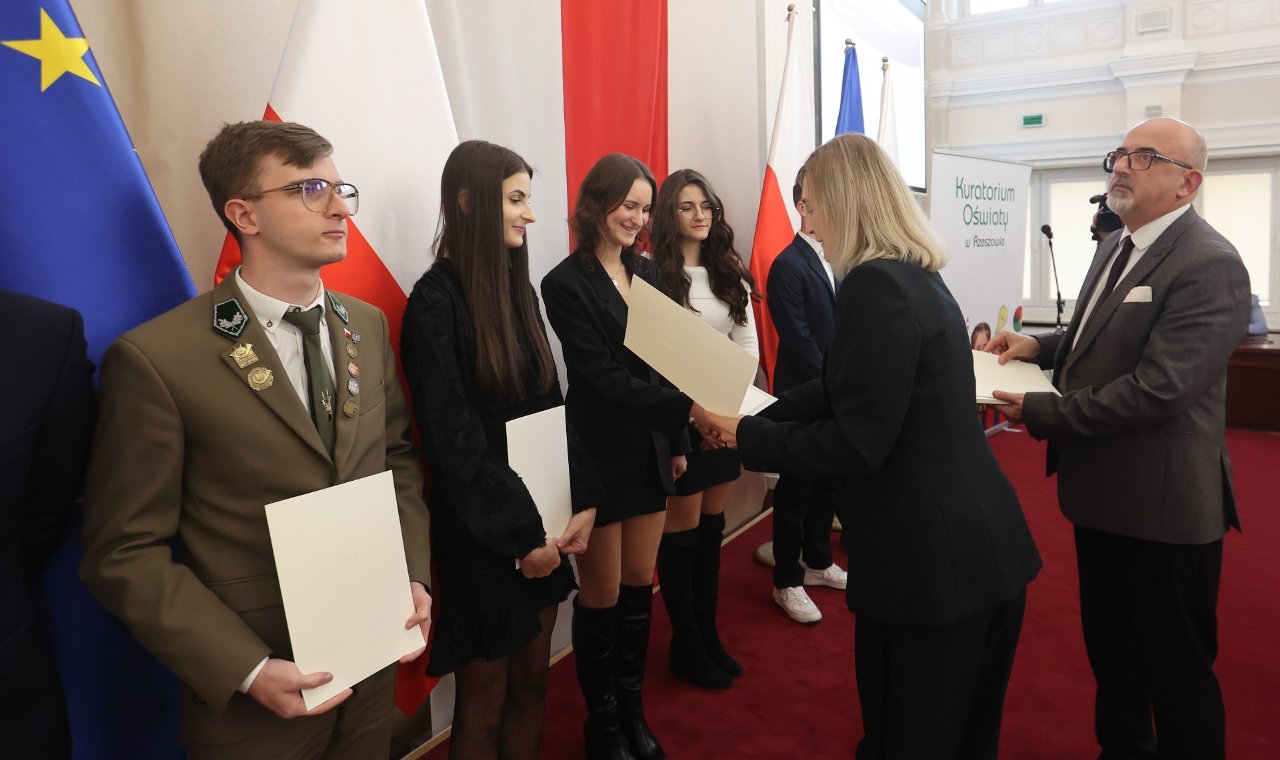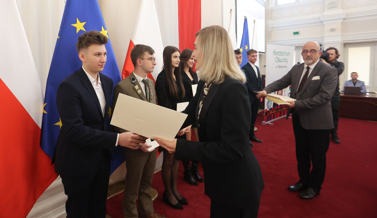 4 grudnia 2025r. w Podkarpackim Urzędzie Wojewódzkim w Rzeszowie odbyło się uroczyste wręczenie Stypendiów Prezesa Rady Ministrów uczniom szkół ponadpodstawowych z województwa podkarpackiego. Uroczystego wręczenia dyplomów stypendialnych dokonali:  Pani Dorota Nowak-Maluchnik – Podkarpacki Kurator Oświaty, Pan Piotr Zych – I Wicekurator Oświaty i Pan Grzegorz Patruś – II Wicekurator Oświaty, a ponad 200 uczniów szkół ponadpodstawowych województwa podkarpackiego uzyskało Stypendium PRM.