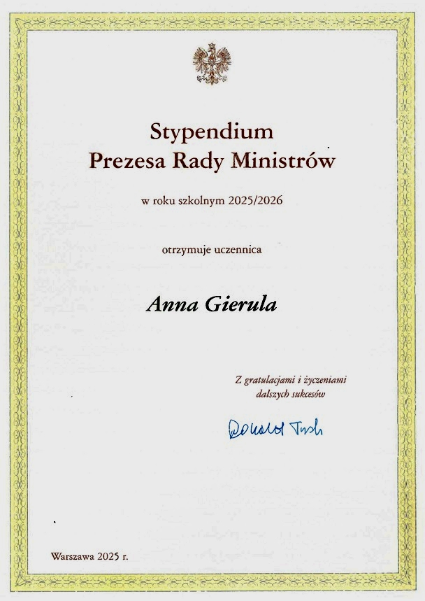 Stypendystką została także Anna Gierula uczennica Zespołu Szkół Zawodowych im. Kardynała Stefana Wyszyńskiego w Dynowie, która w roku szkolnym 2025/2026 jest uczennicą klasy 4TL – 5-letnie technikum w zawodzie technik  logistyk z innowacją pedagogiczną: obsługa ruchu turystycznego. W wyniku klasyfikacji za rok szkolny 2024/2025 uzyskała średnią ocen 5,65 i zachowanie wzorowe. W roku szkolnym 2025/2026 jest stypendystką z ,,Programu wspierania edukacji uzdolnionych uczniów szkół prowadzonych przez Powiat Rzeszowski’’, ponadto w roku szkolnym 2024/2025 była stypendystką: ,,Programu wspierania edukacji uzdolnionych uczniów szkół prowadzonych przez Powiat Rzeszowski’’, projektu ,,Poszerzając horyzonty – stypendia naukowe dla uczniów szkół zawodowych – edycja II’’, a także  laureatką stypendium „Młode Talenty Powiatu  Rzeszowskiego”. W roku szkolnym: 2023/2024 była stypendystka z Programu Stypendialnego Powiatu Rzeszowskiego, ponadto w roku szkolnym 2023/2024 była stypendystka Urzędu Marszałkowskiego Województwa Podkarpackiego w Rzeszowie, projektu: „Poszerzając horyzonty – stypendia naukowe dla uczniów szkół zawodowych – edycja I”. Anna to także laureatka wielu konkursów plastycznych, artystycznych, zawodowych szczebla powiatowego, wojewódzkiego czy ogólnopolskiego.