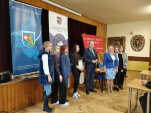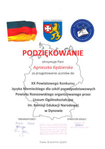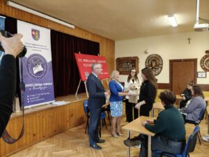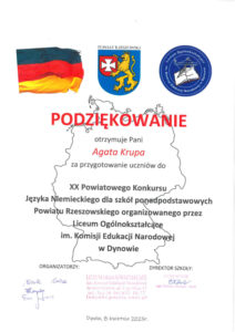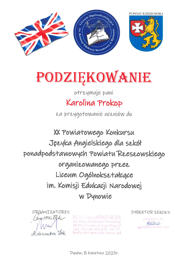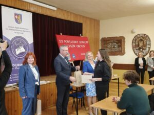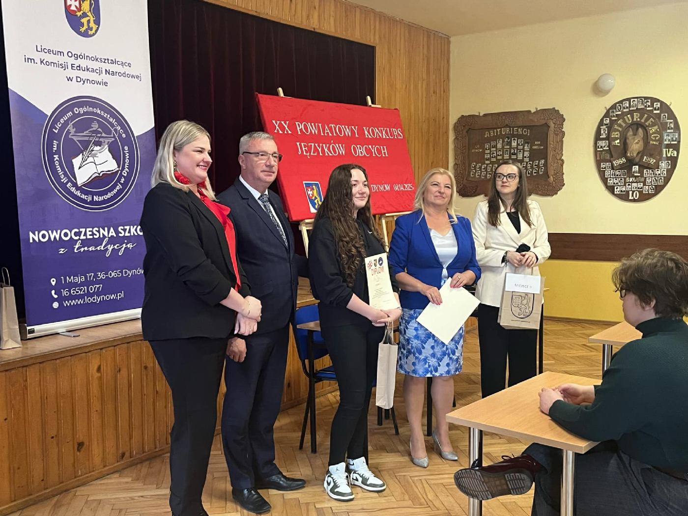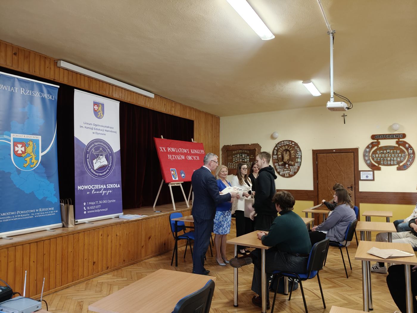 Byli to: Radosław Weselak z klasy 2TI, Eliza Tyka, Maciej Motowidło, Marcel Kic z klasy 3TL, Szymon Bielec oraz Zuzanna Pomykała z klasy 3TI w kategorii język angielski. Uczestnikami w konkursie z języka niemieckiego byli: Radosław Weselak z klasy 2TI, Eliza Tyka z klasy 3TL, Patrycja Śliwa, Klaudia Stodolak z klasy 3TH oraz Michał Rachwał z klasy 5TI.Miło nam poinformować, że Eliza Tyka z klasy 3TL ( 5 – letnie Technikum w zawodzie technik logistyk) zajęła I miejsce z języka angielskiego oraz II miejsce z języka niemieckiego w całym Powiecie Rzeszowskim, wykazując się znakomitą znajomością obu języków. Gratulujemy! Nagrody laureatom konkursu wręczyli: Pan Jerzy Bednarz Wicestarosta Rzeszowski oraz Pani Elżbieta Klaczak – Łach Dyrektor Liceum Ogólnokształcącego im. KEN w Dynowie, podkreślając wysoki poziom wiedzy uczestników oraz ich zaangażowanie w naukę języków obcych jak i znaczenie nauki języków obcych we współczesnym świecie. Opiekunami były nauczycielki języka niemieckiego: Pani Agnieszka Kędzierska i Pani Agata Krupa oraz nauczycielki języka angielskiego: Pani Karolina Prokop, Pani Magdalena Wolańska i Pani Kinga Ziaja. Wszystkim naszym uczniom dziękujemy za zaangażowanie i życzymy dalszych sukcesów w przyszłorocznych konkursach.