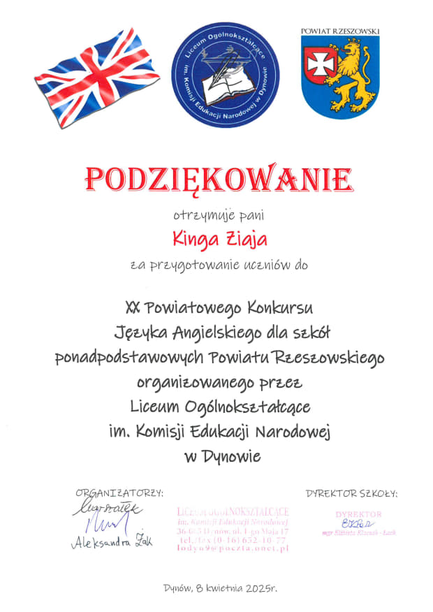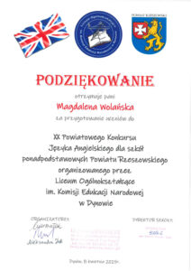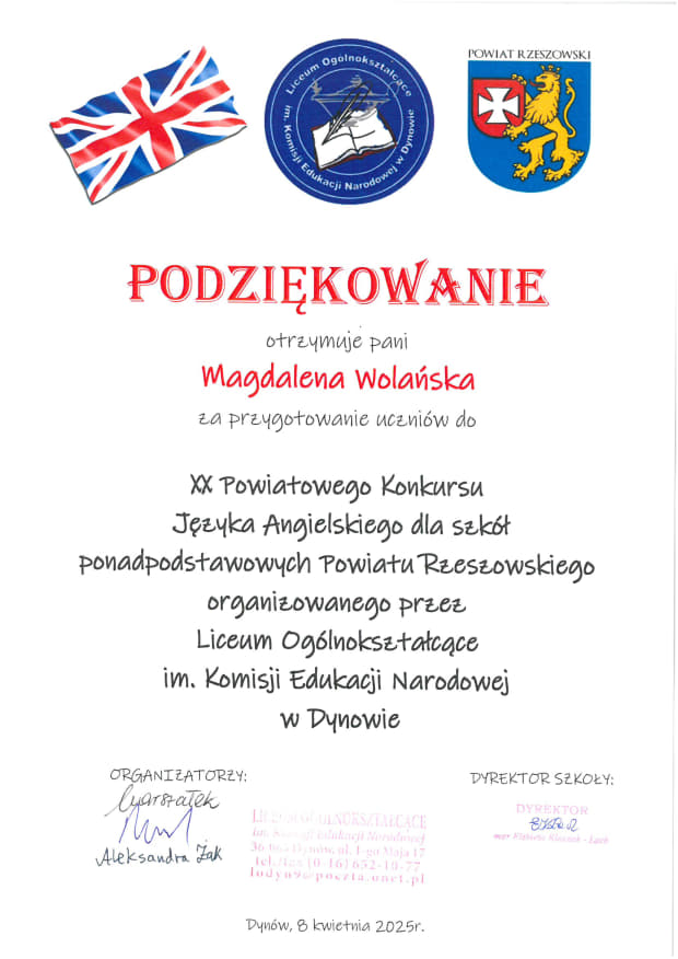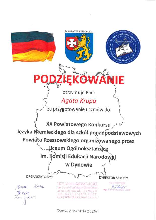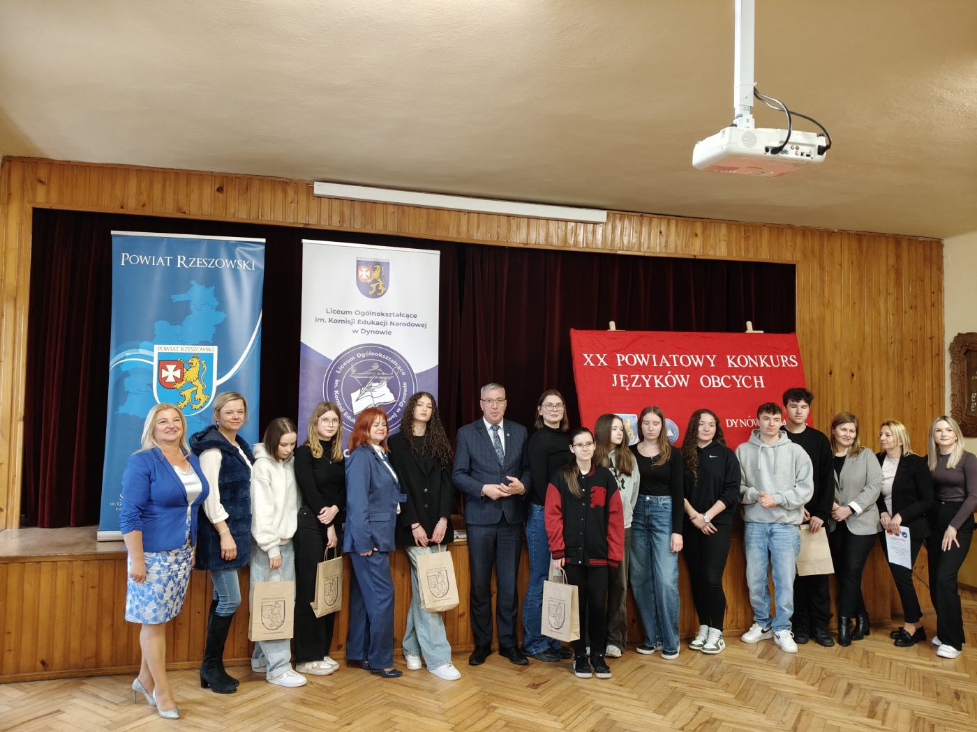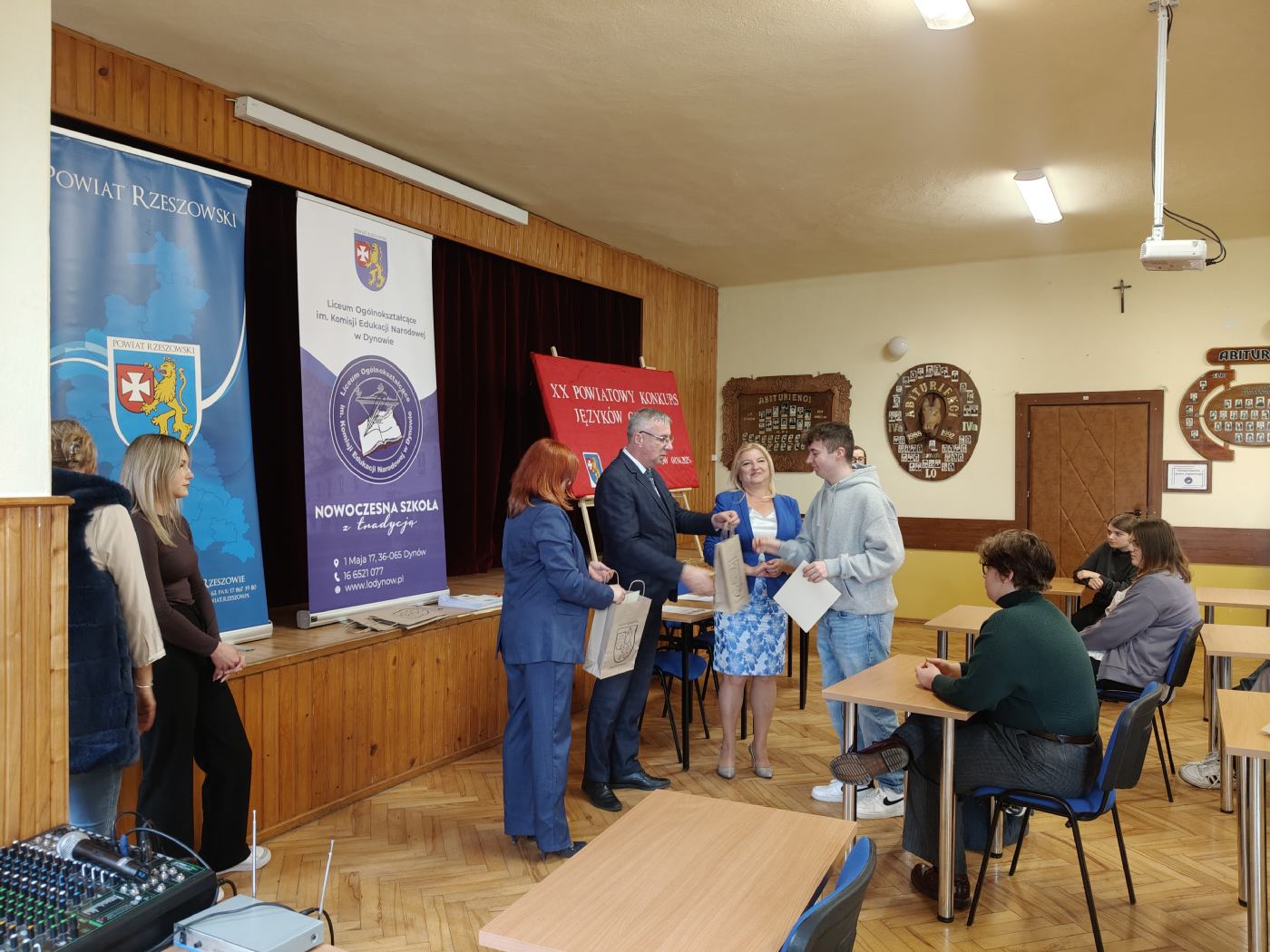 W dniu 08.04.2025r. w Liceum Ogólnokształcącym im. KEN w Dynowie odbył się XX Powiatowy Konkurs Języków Obcych dla uczniów szkół ponadpodstawowych Powiatu Rzeszowskiego z języka angielskiego i niemieckiego pod honorowym patronatem Starosty Rzeszowskiego Pana Krzysztofa Jarosza. W konkursie wzięli udział także uczniowie Zespołu Szkół Zawodowych im. Kardynała Stefana Wyszyńskiego w Dynowie, którzy zakwalifikowali się do etapu powiatowego podczas szkolnych eliminacji.