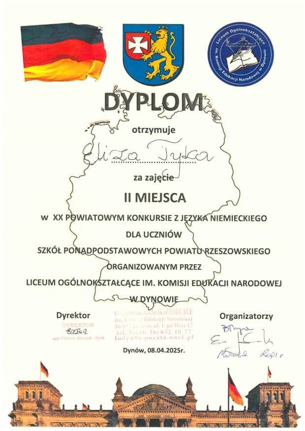 Sukcesy Elizy Tyki uczennicy Zespołu Szkół Zawodowych im. Kardynała Stefana Wyszyńskiego w Dynowie w XX Powiatowym Konkursie Języków Obcych dla uczniów szkół ponadpodstawowych Powiatu Rzeszowskiego – język angielski i niemiecki