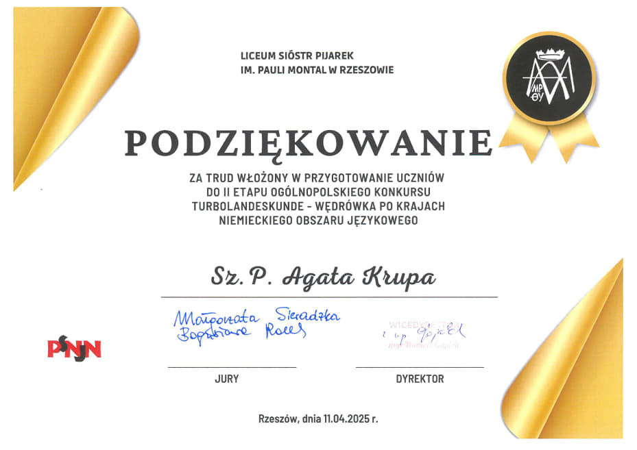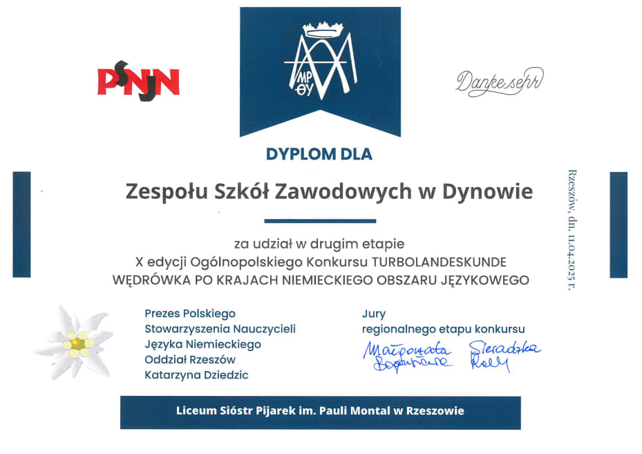 Była to X edycja 2024/2025 konkursu – „Turbolandeskunde – Deutschland”. Organizatorem konkursu jest # Polskie Stowarzyszenie Nauczycieli Języka Niemieckiego. Konkurs odbywa się pod patronatem #Międzynarodowego Stowarzyszenia Nauczycieli Języka Niemieckiego (IDV) oraz przy wsparciu #GoetheInstitut w Krakowie. Uczniowie odpowiadali w grupach trzyosobowych na pytania zamknięte i otwarte przedstawione na prezentacji multimedialnej. Dotyczyły one m.in. osobistości, geografii, historii, gospodarki, kultury oraz realiów krajów niemieckiego obszaru językowego. W roku szkolnym 2024/2025 pytania dotyczyły Niemiec. Oprócz umiejętności językowych, należało wykazać się przede wszystkim szczegółową wiedzą merytoryczną na temat tego kraju. W tym roku, podobnie jak w poprzednim konkurs uświetniły swoją obecnością dr Małgorzata Sieradzka oraz dr Bogusława Rolek z #Instytut Germanistyki Uniwersytetu Rzeszowskiego. Nasze uczennice z klasy 3TH (technik handlowiec) – Amelia Baluch, Patrycja Śliwa, Renata Tomoń – podjęły się tego niełatwego zadania, godnie reprezentując naszą szkołę i rywalizując z uczniami z 14 innych szkół w regionie. Dziękując za udział życzymy sukcesów w następnych konkursach. Opiekunką uczennic była Pani Agata Krupa.