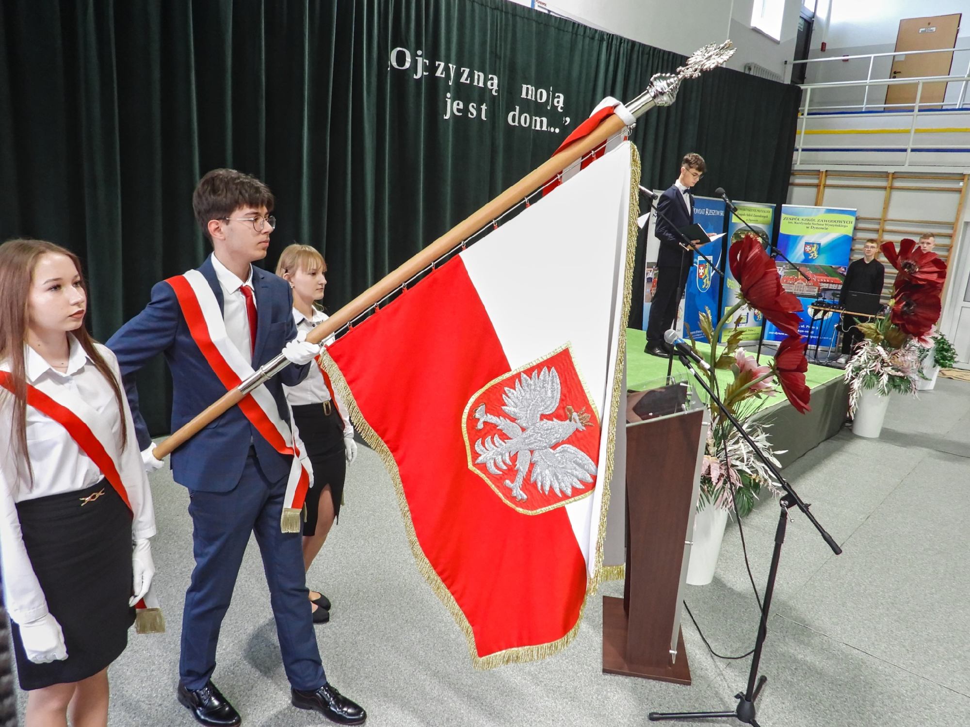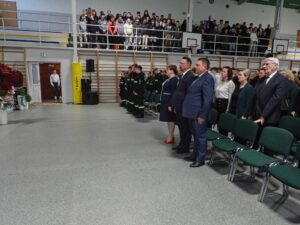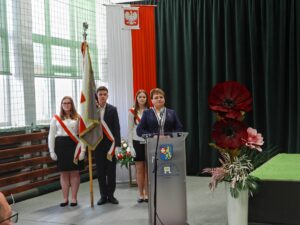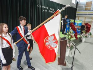 Na zakończenie uroczystości głos zabrała pani Dyrektor Halina Cygan, która serdecznie podziękowała młodzieży oraz nauczycielom za przygotowanie pięknego programu artystycznego. Podkreśliła, że tego rodzaju inicjatywy są nie tylko wyrazem szacunku dla historii, ale również ważną lekcją patriotyzmu i wspólnoty. Pani Dyrektor zwróciła uwagę na znaczenie pielęgnowania pamięci historycznej oraz szacunku dla symboli narodowych, które kształtują naszą tożsamość i budują więź międzypokoleniową. W swoim wystąpieniu poświęciła również kilka słów Patronowi szkoły – Kardynałowi Stefanowi Wyszyńskiemu. Przypomniała jego nauczanie o miłości do Ojczyzny, odpowiedzialności za drugiego człowieka oraz o duchowej sile narodu. Zaznaczyła, że wartości, które głosił Prymas Tysiąclecia, pozostają aktualne i są drogowskazem dla młodych ludzi w dzisiejszym świecie. Jej słowa stanowiły piękne podsumowanie uroczystości, skłaniając zebranych do refleksji nad znaczeniem wolności, wiary i wspólnoty. galeria zdjęć ..>>
