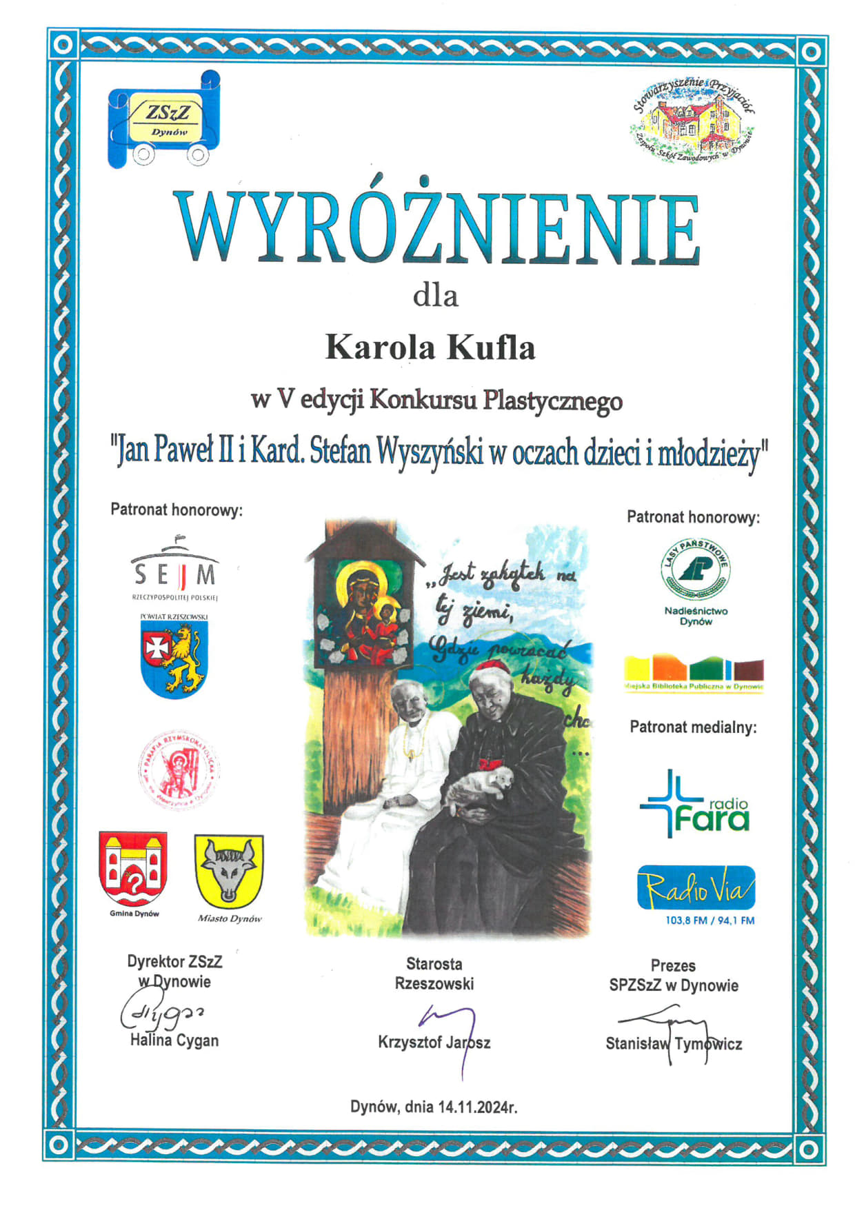 Zespół Szkół Zawodowych im. Kardynała Stefana Wyszyńskiego w Dynowie i Stowarzyszenie Przyjaciół Zespołu Szkół Zawodowych w Dynowie są organizatorami V edycji konkursu plastycznego „Jan Paweł II i Kardynała Stefan Wyszyński w oczach dzieci i młodzieży” dla szkół z Pogórza Przemysko – Dynowskiego pod honorowym patronatem: Poseł na Sejm RP dr Ewy Leniart, Starosty Rzeszowskiego dra Krzysztofa Jarosza, Dziekana Dekanatu Dynów Ks. Prałata dra Norberta Podhoreckiego, Wójta Gminy Dynów Wojciecha Piecha, Burmistrza Miasta Dynów Zygmunta Frańczaka, Nadleśniczego Nadleśnictwa Dynów Jacka Gałuszki, Dyrektora Miejskiej Biblioteki Publicznej w Dynowie Grażyny Paździornej oraz patronatem medialnym: Radia FARA – Rozgłośni Archidiecezji Przemyskiej i „Via” Katolickiego Radia Rzeszów.