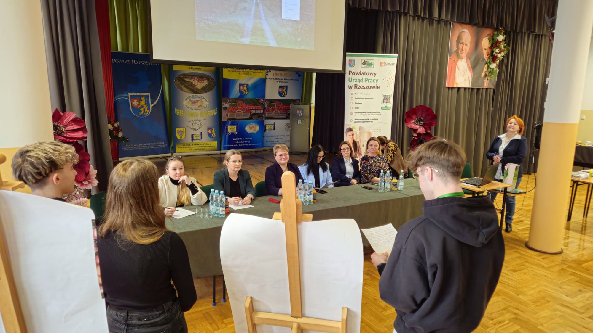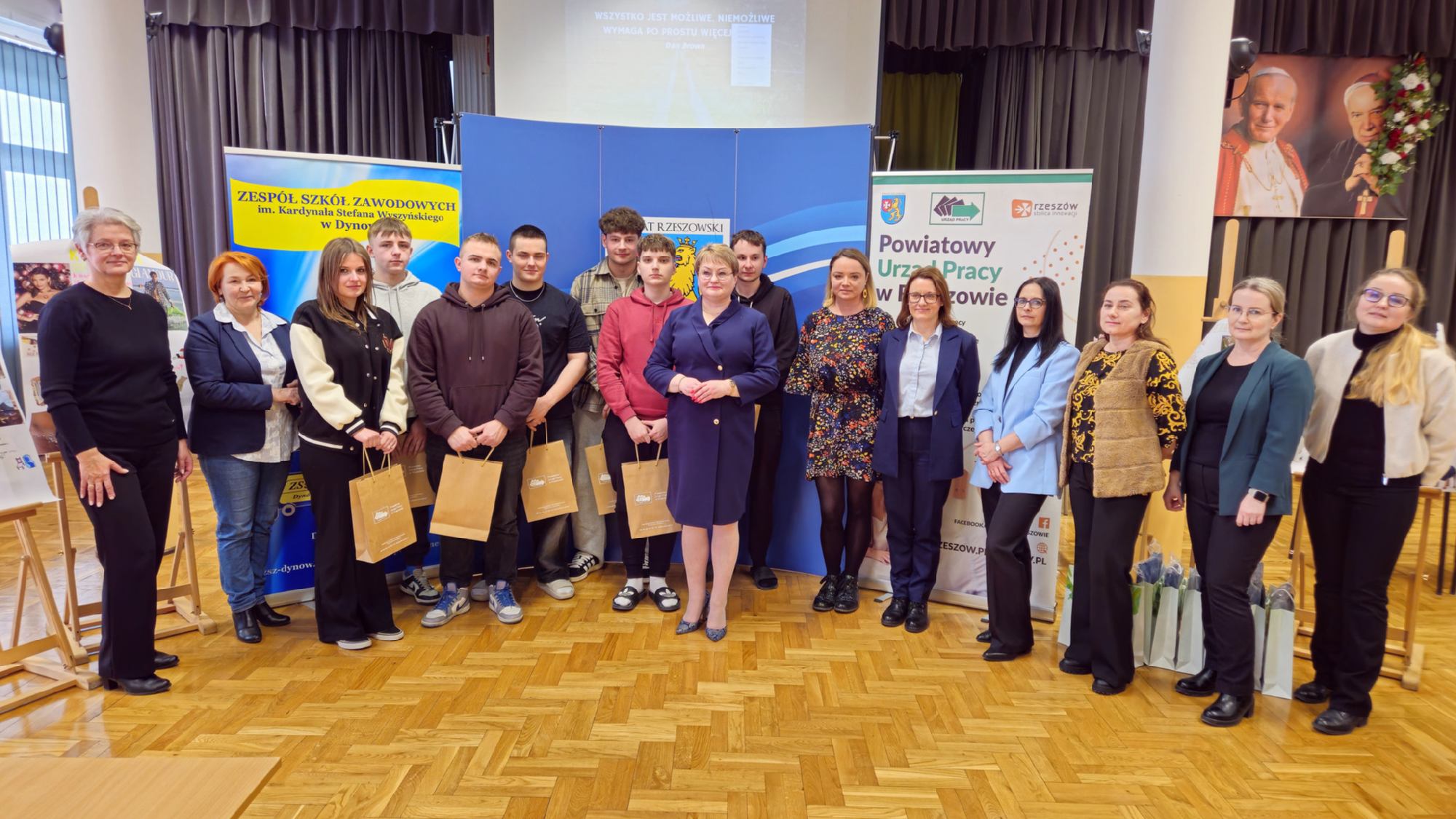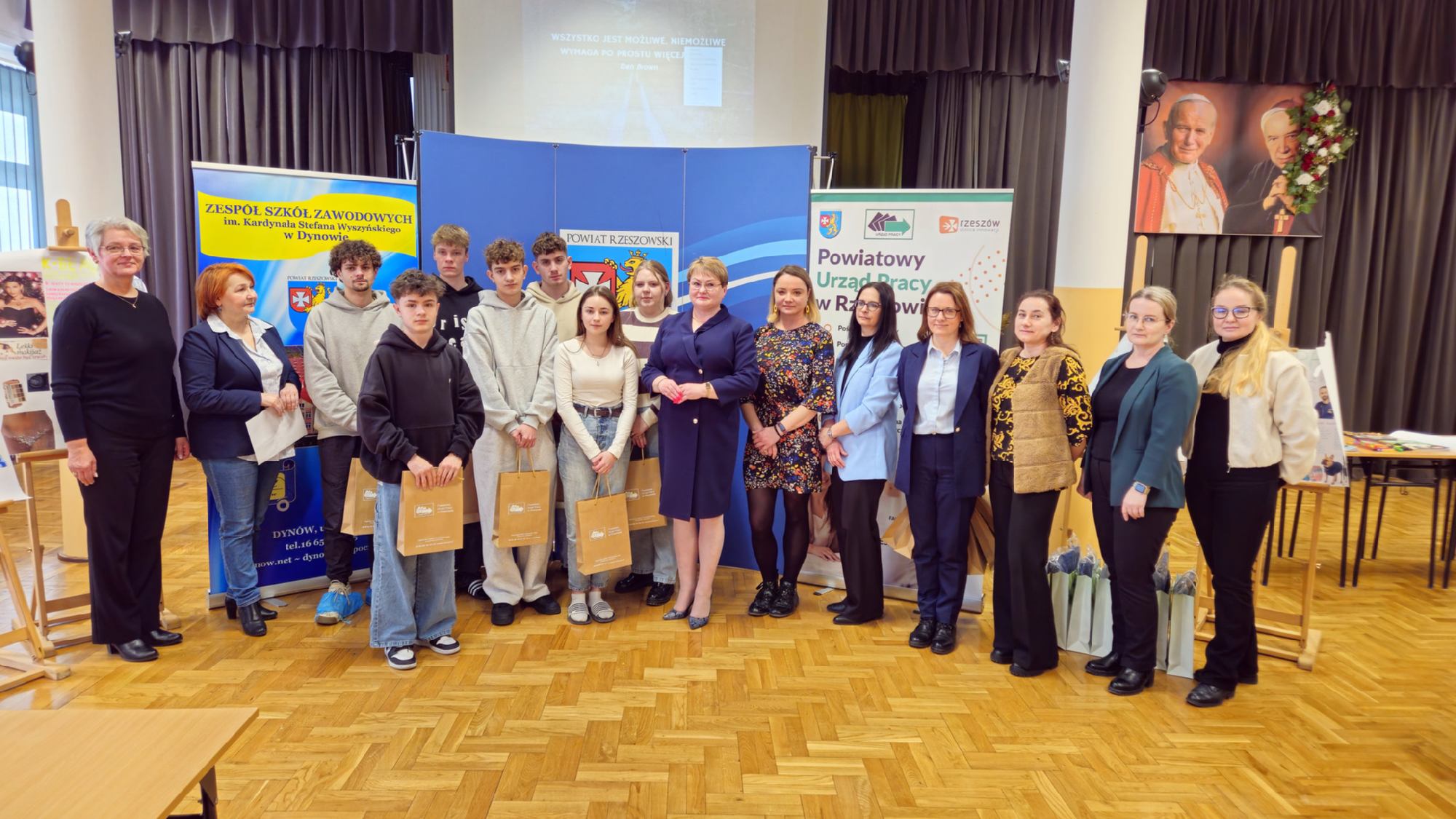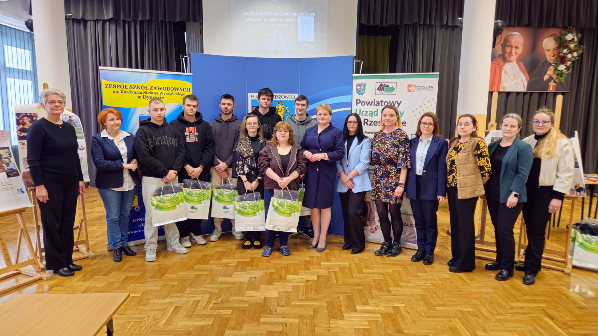 W dniu 19 stycznia 2026 roku w Zespole Szkół Zawodowych im. Kardynała Stefana Wyszyńskiego w Dynowie odbyły się „Warsztaty przedsiębiorczości”, zorganizowane we współpracy z Powiatowym Urzędem Pracy w Rzeszowie. Wydarzenie skierowane było do uczniów klas piątych 5- letniego technikum: kl. 5TPS (technik pojazdów samochodowych), kl. 5THL (technik logistyk/technik handlowiec), kl. 5TI (technik informatyk) oraz do uczniów klasy 3a branżowej szkoły I stopnia. Celem spotkania było kształtowanie postaw przedsiębiorczych, rozwijanie kreatywności oraz przygotowanie młodzieży do świadomego planowania swojej przyszłości zawodowej i funkcjonowania na rynku pracy. Uczniowie mieli możliwość poznania procedury ubiegania się o dotacje na otwarcie jednoosobowej działalności gospodarczej oraz ćwiczenia praktycznych umiejętności sporządzania biznesplanów niezbędnych do uzyskania takiego dofinansowania. Uroczystego otwarcia warsztatów dokonała Pani Halina Cygan, dyrektor szkoły oraz Pani Beata Madera, kierownik Wydziału Instrumentów Rynku Pracy i Projektów Powiatowego Urzędu Pracy w Rzeszowie, które powitały uczestników, akcentując istotę kształtowania postaw przedsiębiorczych oraz rozwijania samodzielności zawodowej wśród młodzieży.