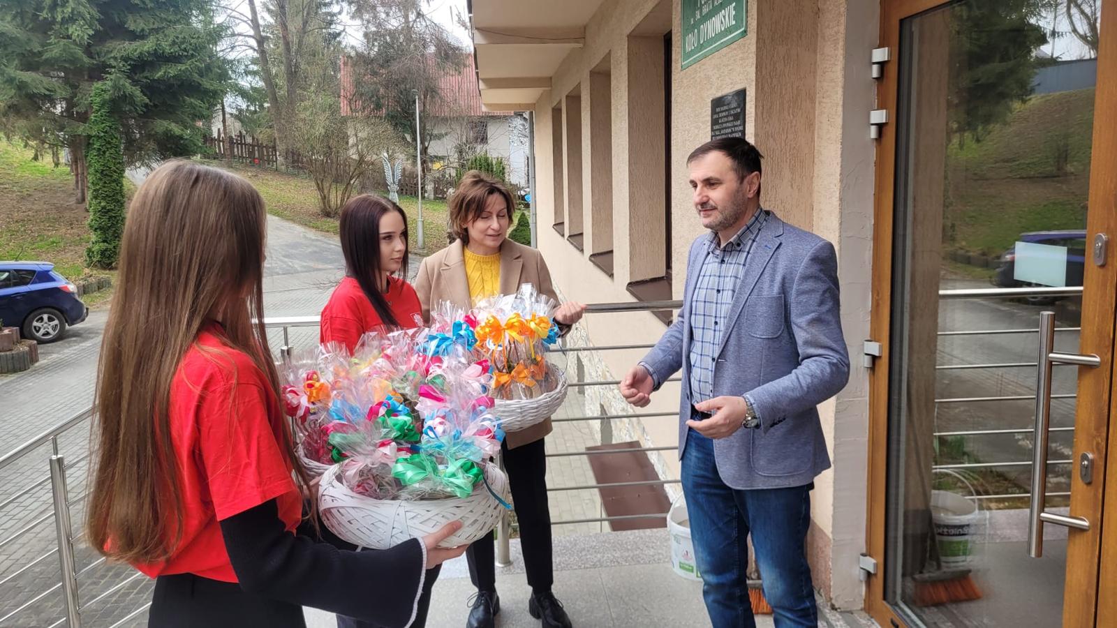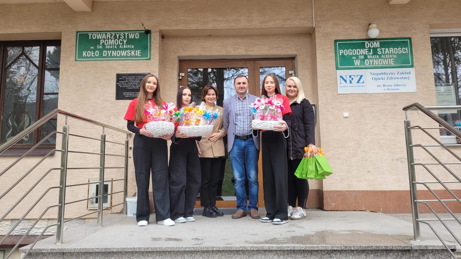 W dniu 26.03.2026 r. członkowie Szkolnego Koła Caritas z Zespołu Szkół Zawodowych im. Kard. Stefana Wyszyńskiego w Dynowie: Renata Tomoń, Sylwia Dudek oraz Klaudia Stodolak, pod opieką ks. Dominika Majchrowicza oraz Pani Karoliny Bal, włączyli się w przygotowanie wielkanocnych upominków i życzeń dla Pensjonariuszy Domu Pogodnej Starości im. św. Brata Alberta w Dynowie. Niestety, w tym roku, ze względu na panujący wirus grypy nie mogliśmy osobiście spotkać się z Pensjonariuszami, aby przekazać im uśmiech, dobre słowo i wspólnie przeżyć tę wyjątkową, świąteczną chwilę. Było to dla nas szczególnie trudne, ponieważ każde takie spotkanie wnosi wiele radości i wzruszeń. Przygotowane z serca świąteczne upominki oraz serdeczne życzenia zostały przekazane na ręce Pana Adama Sochackiego z nadzieją, że staną się choć małym znakiem naszej pamięci, życzliwości i bliskości.